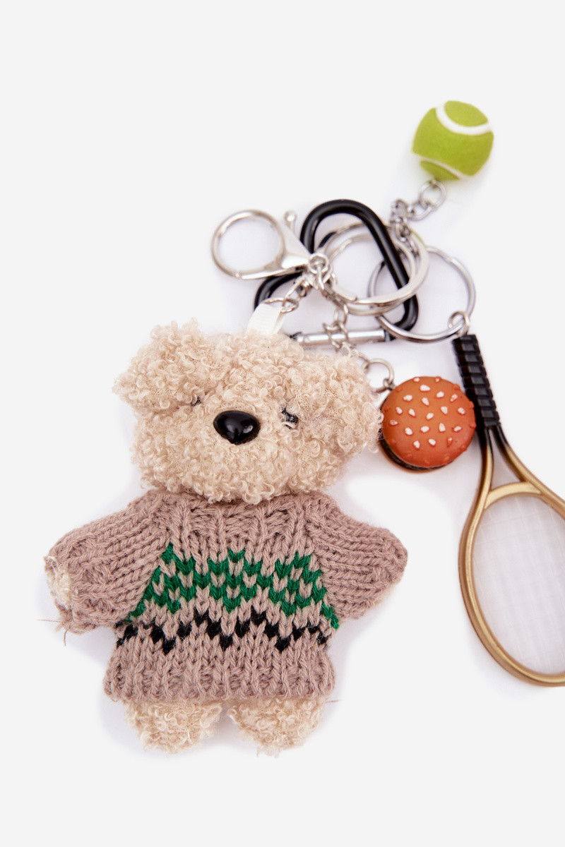 Pakabukas raktams meškiukai megztinyje su raketa ir kamuoliu hamburgeris aukso spalvos