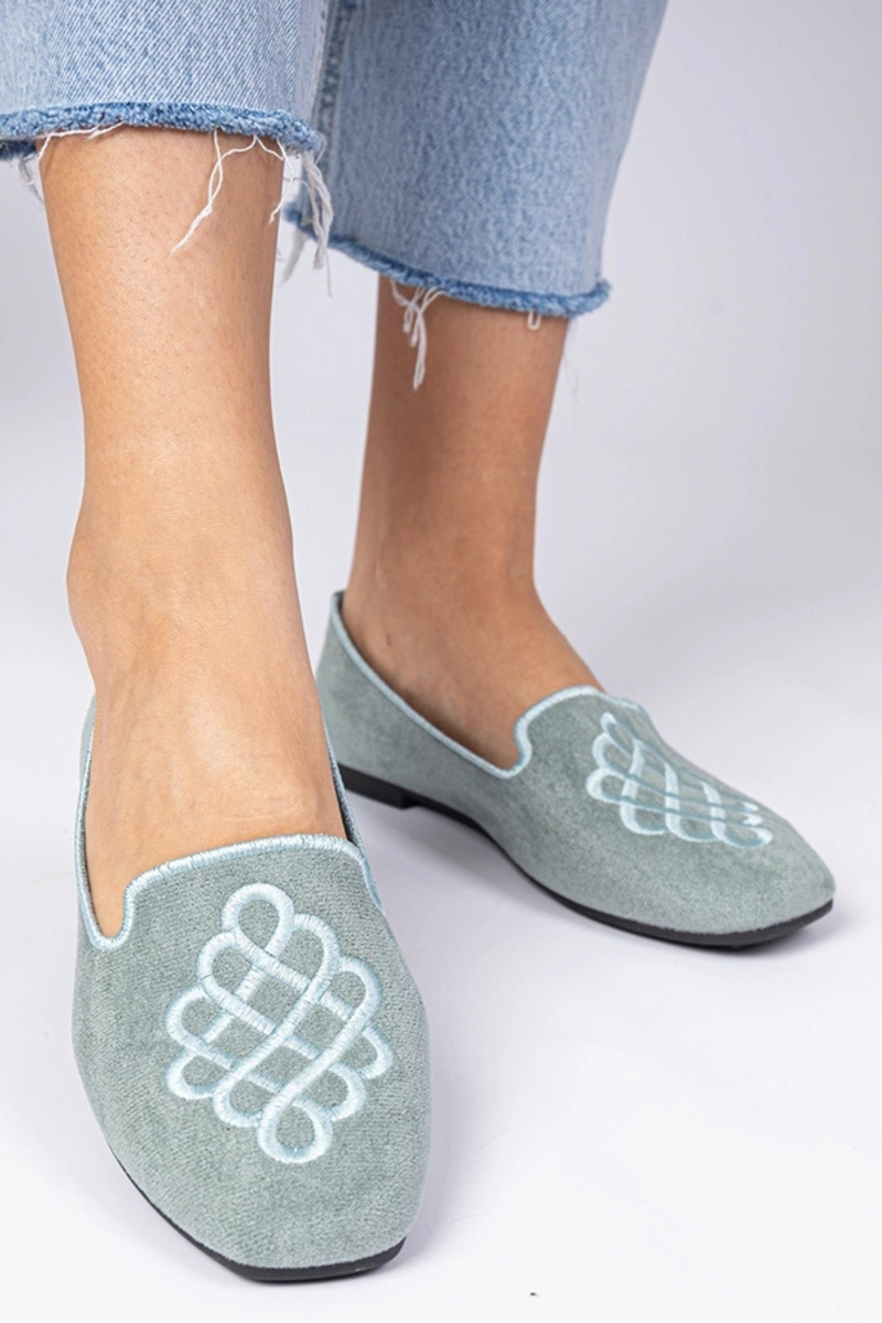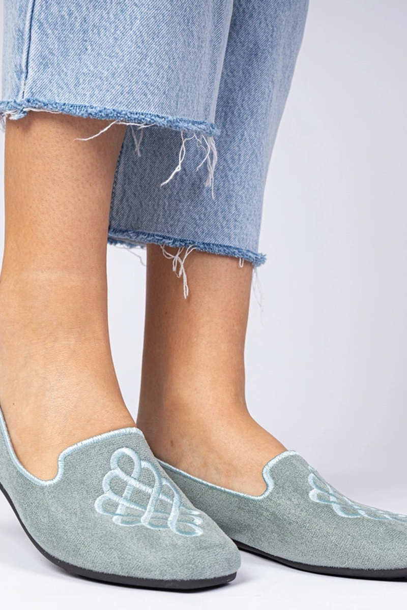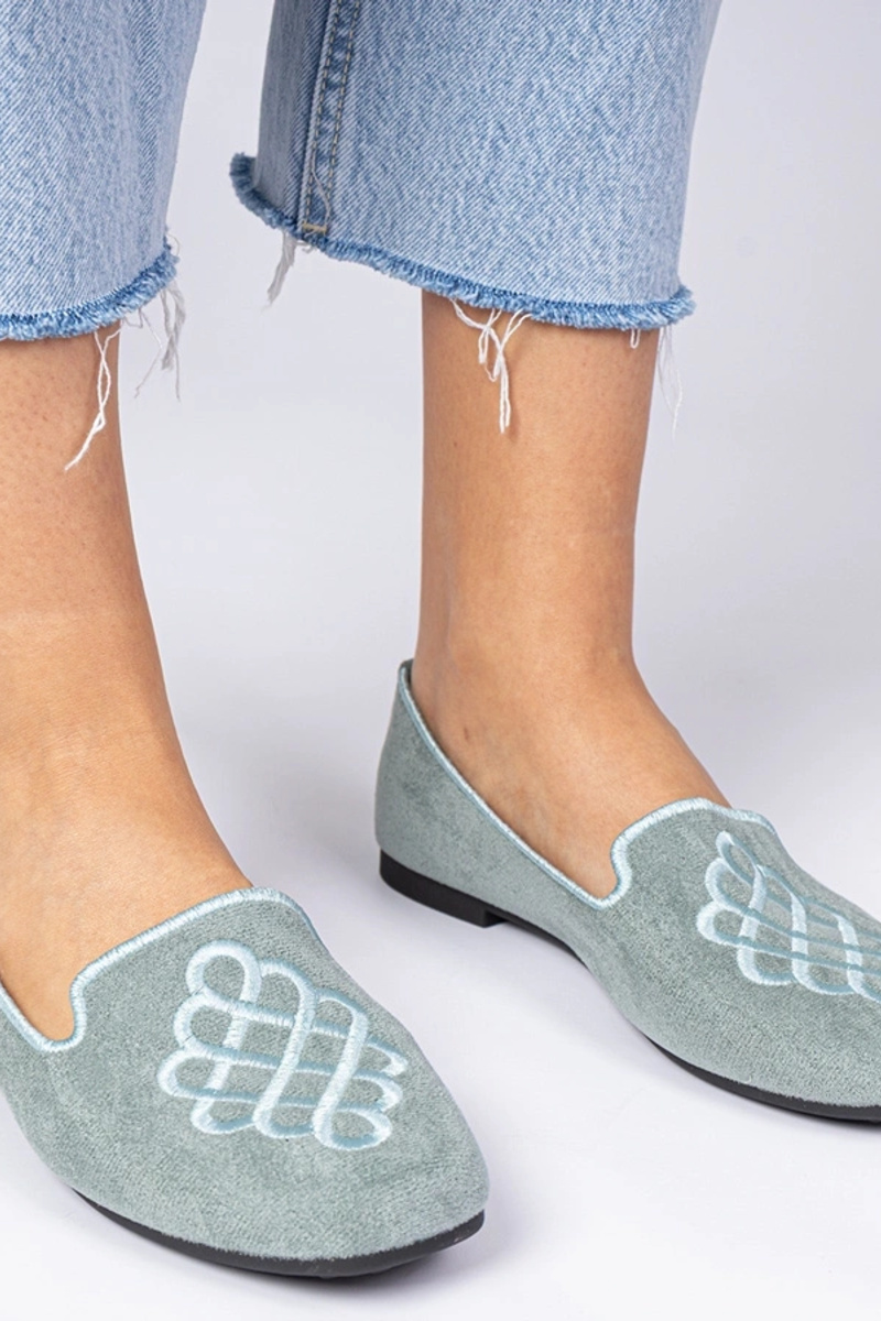 Žalios moteriškos balerinų bateliai iš dirbtinio zomšo su siuvinėjimu Ronna
