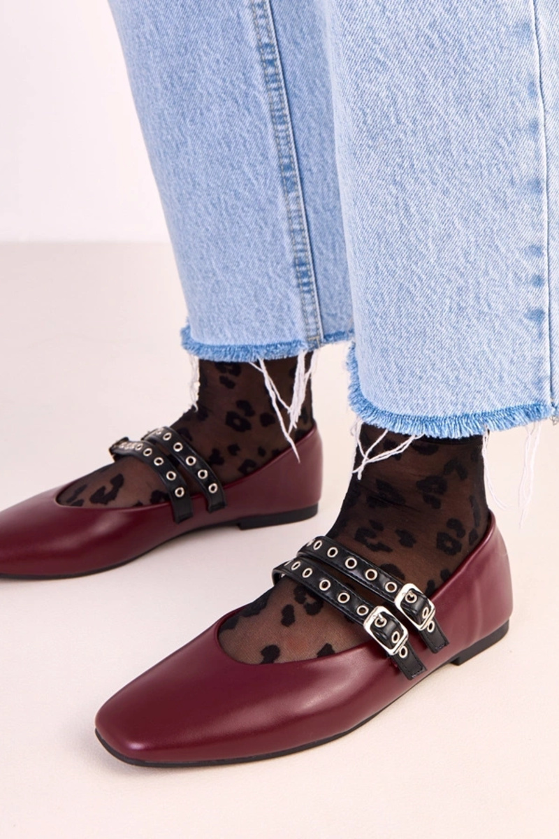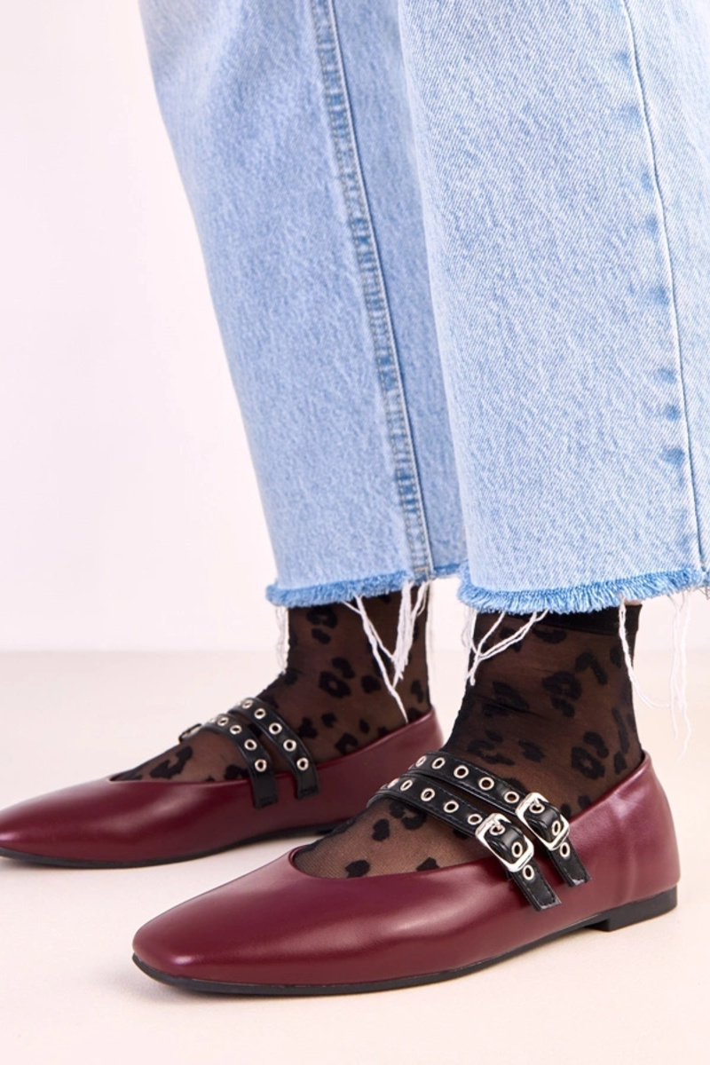 Tamsiai raudonos spalvos Alfira balerinės su kvadratiniu priekiu ir sagtimis