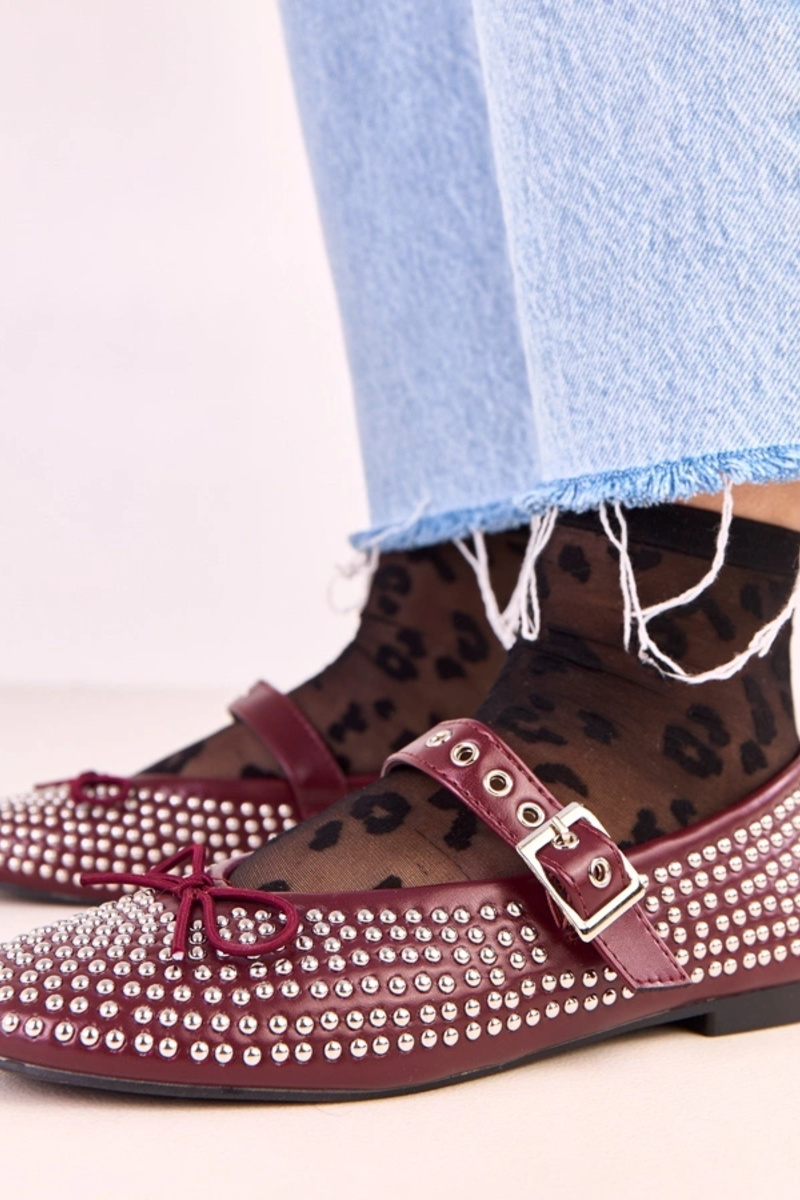 Tamsiai raudonos spalvos Mylie balerinės, dekoruotos kniedėmis ir kaspinu