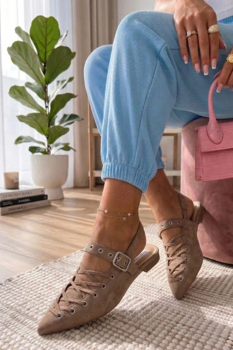 Karamelės spalvos balerinų batai su atvira kulnu puošti raišteliais Seraphina