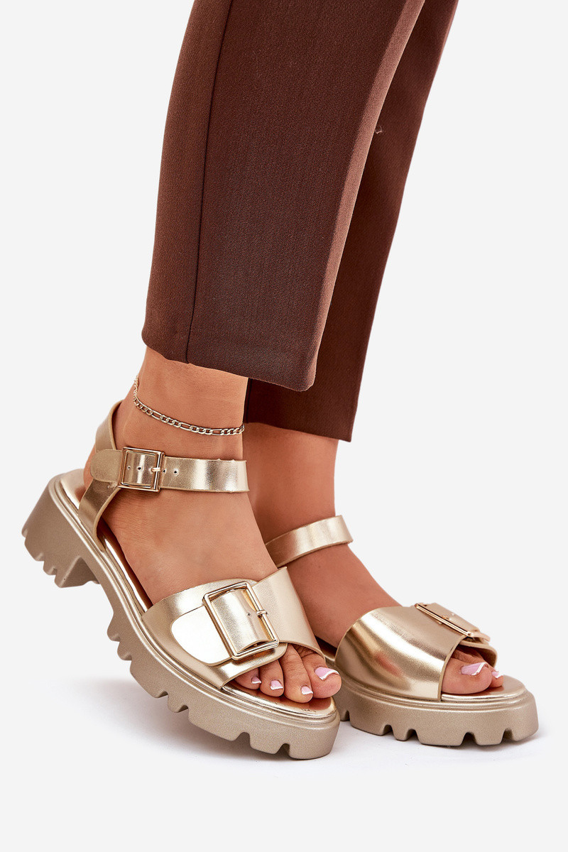 Moteriškos dirbtinės odos basutės su sagtimis aukso spalvos