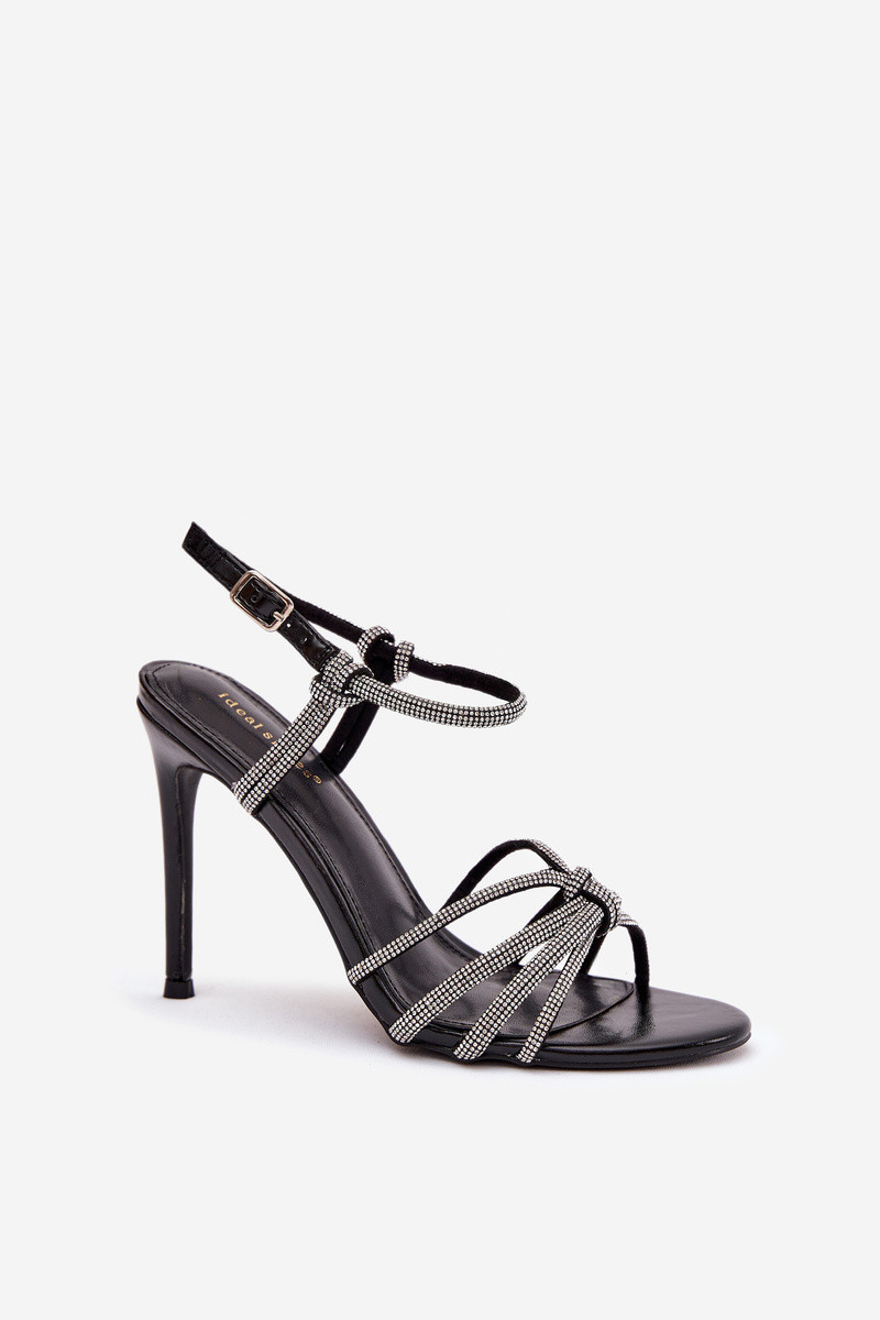 Juodos spalvos moteriškos basutės su plonais kulniukais, juostelėmis ir cirkoniais Tanelle