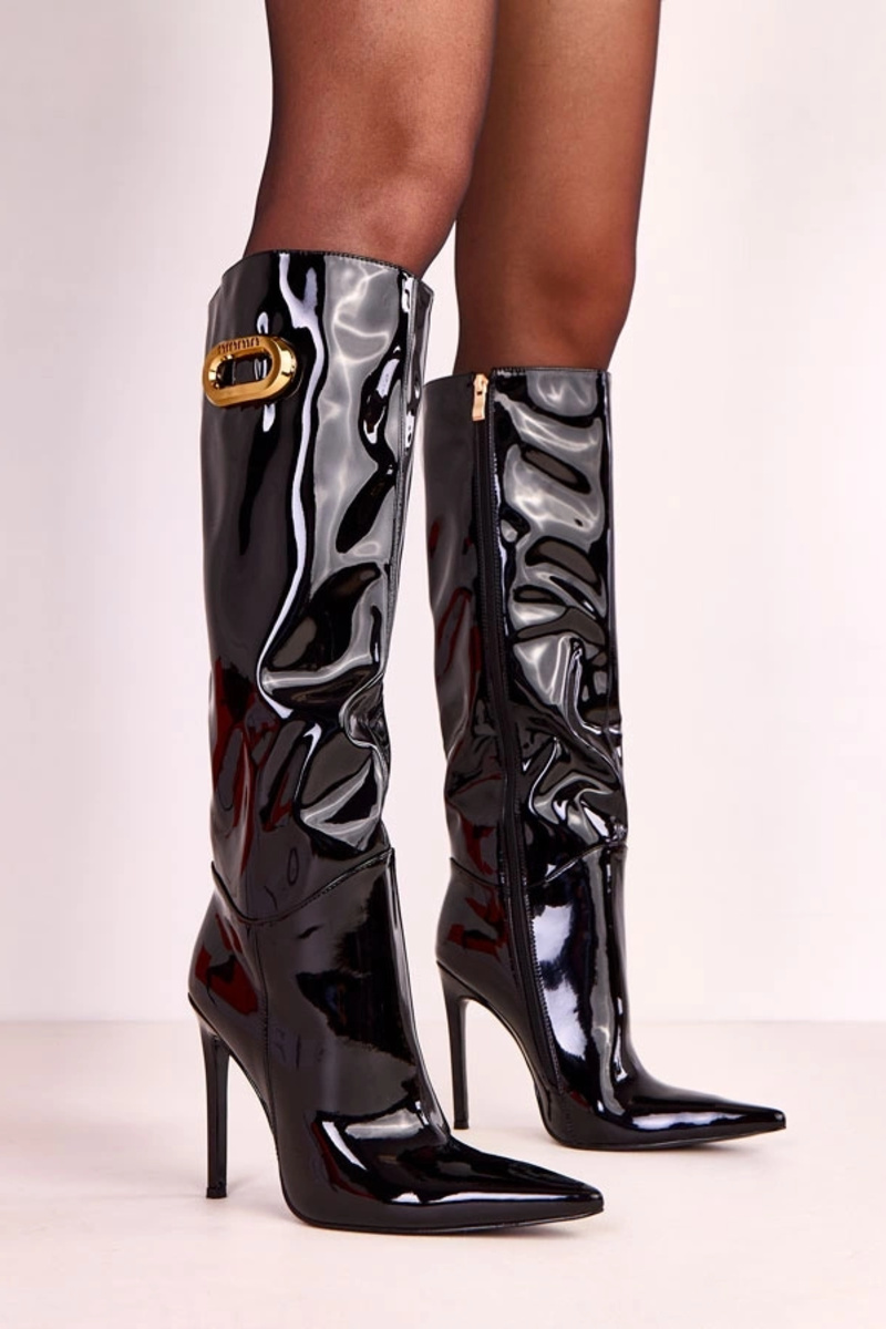 Juodi lakiniai ilgaauliai batai su aukso spalvos puošyba Herrera