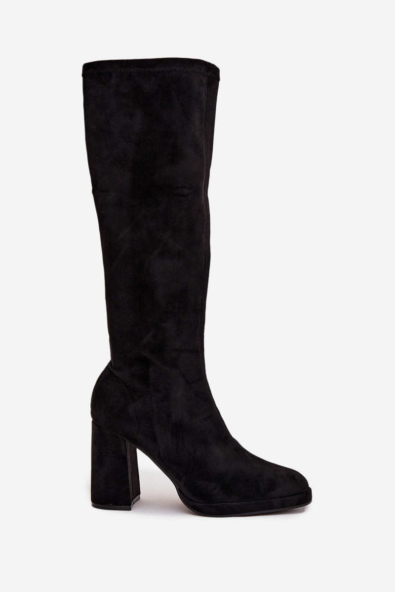 Moteriški ilgaauliai batai su siūlėmis ant stulpelio kulno juodos spalvos "Brivana"