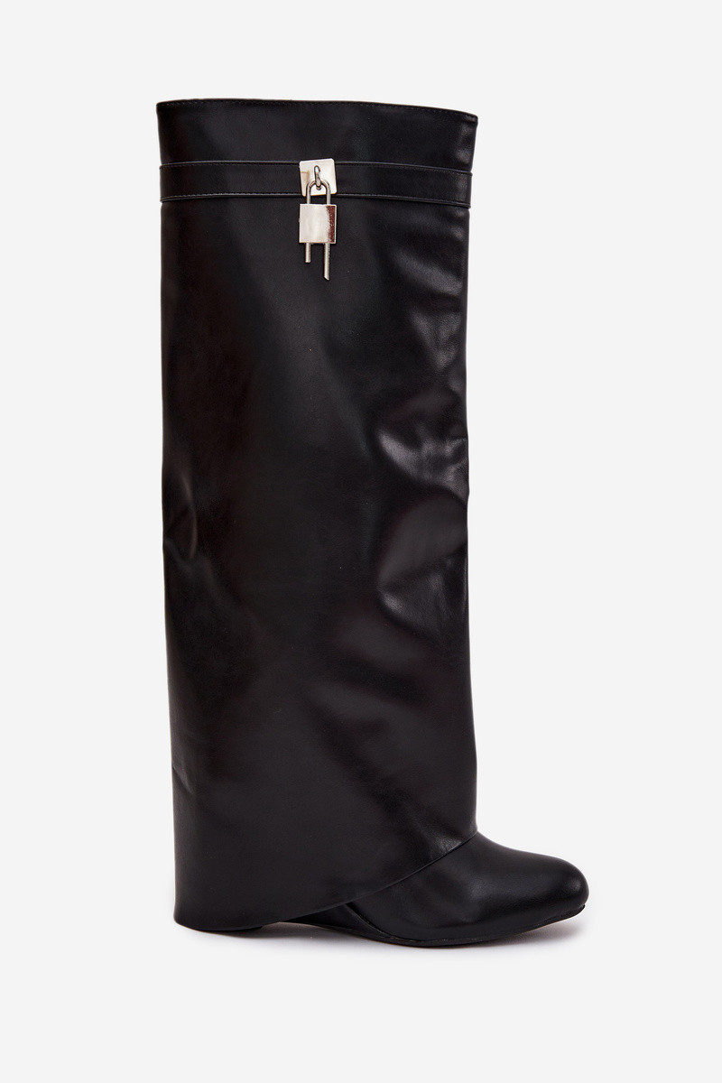 Moteriški ilgaauliai batai ant platformos su dirželiais ir sidabrinėmis detalėmis iš eko odos juodos spalvos Korivelle