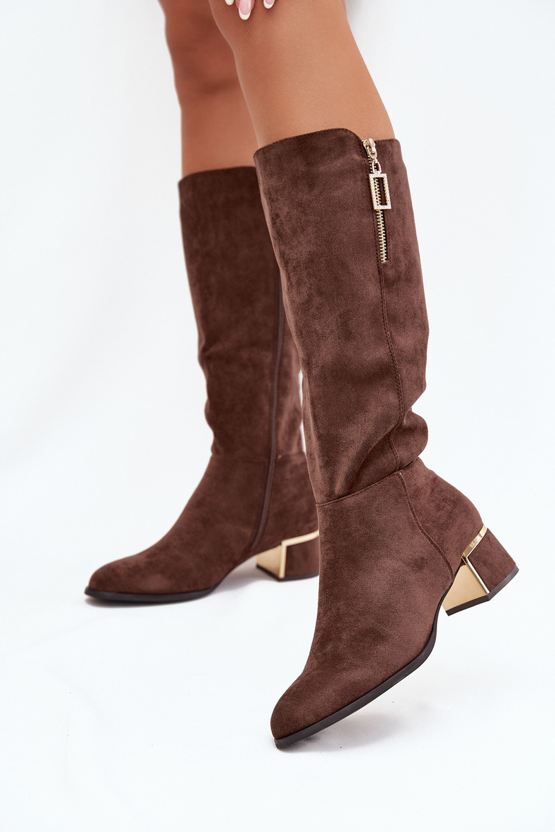Moteriški ilgaauliai batai su kulniukais iš eko zomšos rudos spalvos Lyvienne