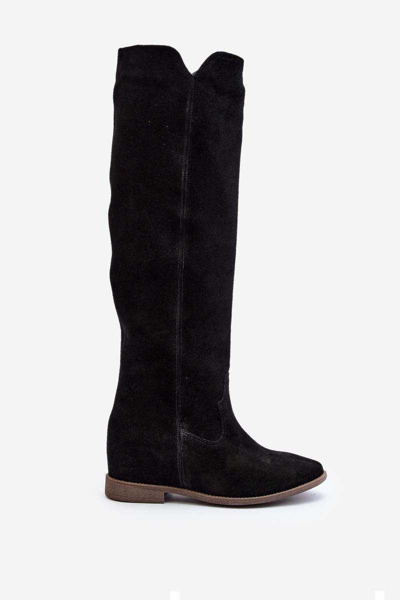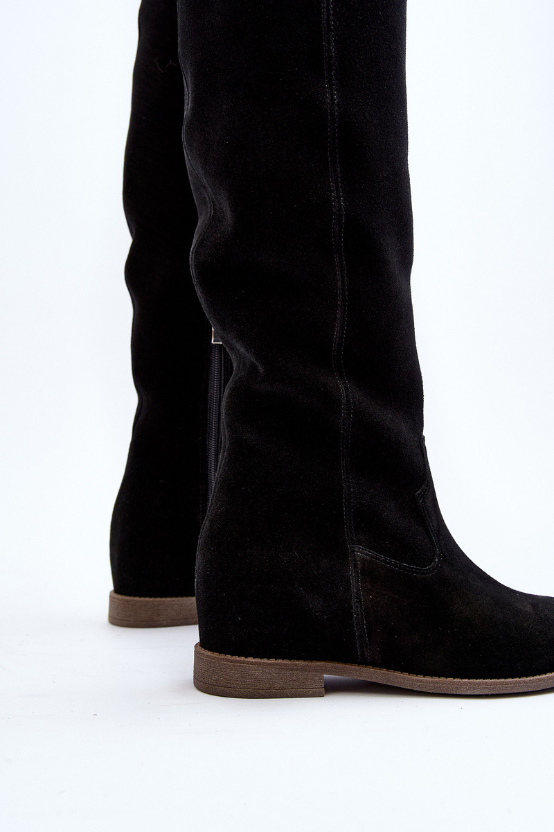 Juodos spalvos zomšiniai ilgaauliai batai iki kelių su plačiais kulniukais „Zazoo 3407"