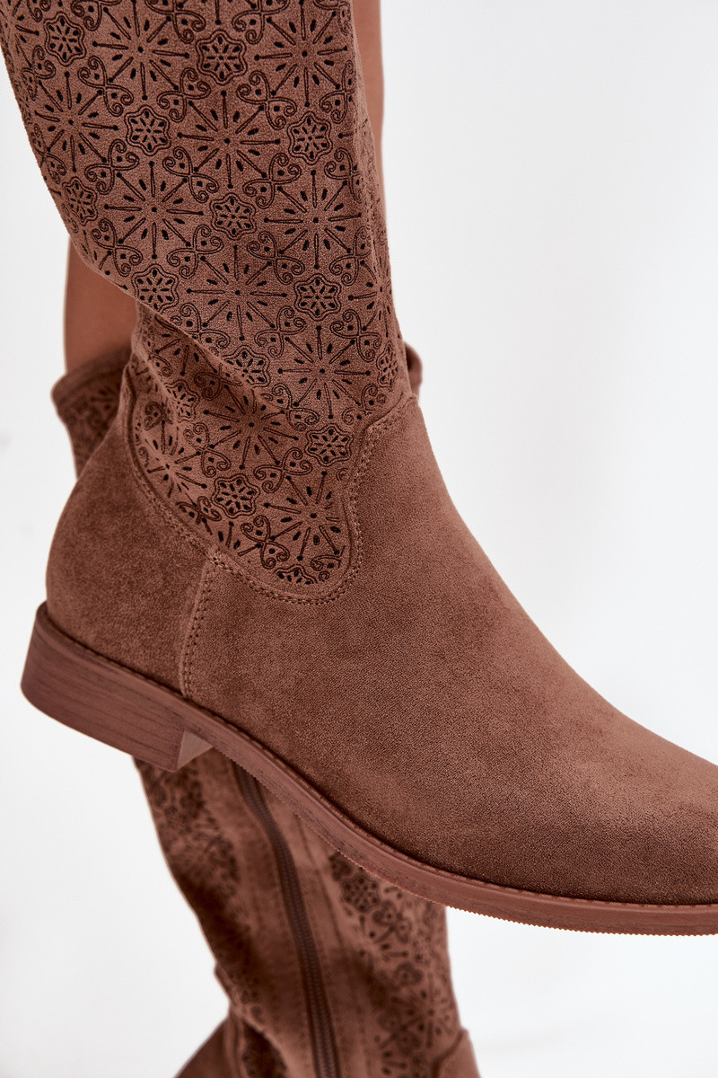 Moteriški ilgaauliai batai su ažūro elementais ir plačiais kulniukais S.Barski HY52-534 rudos spalvos