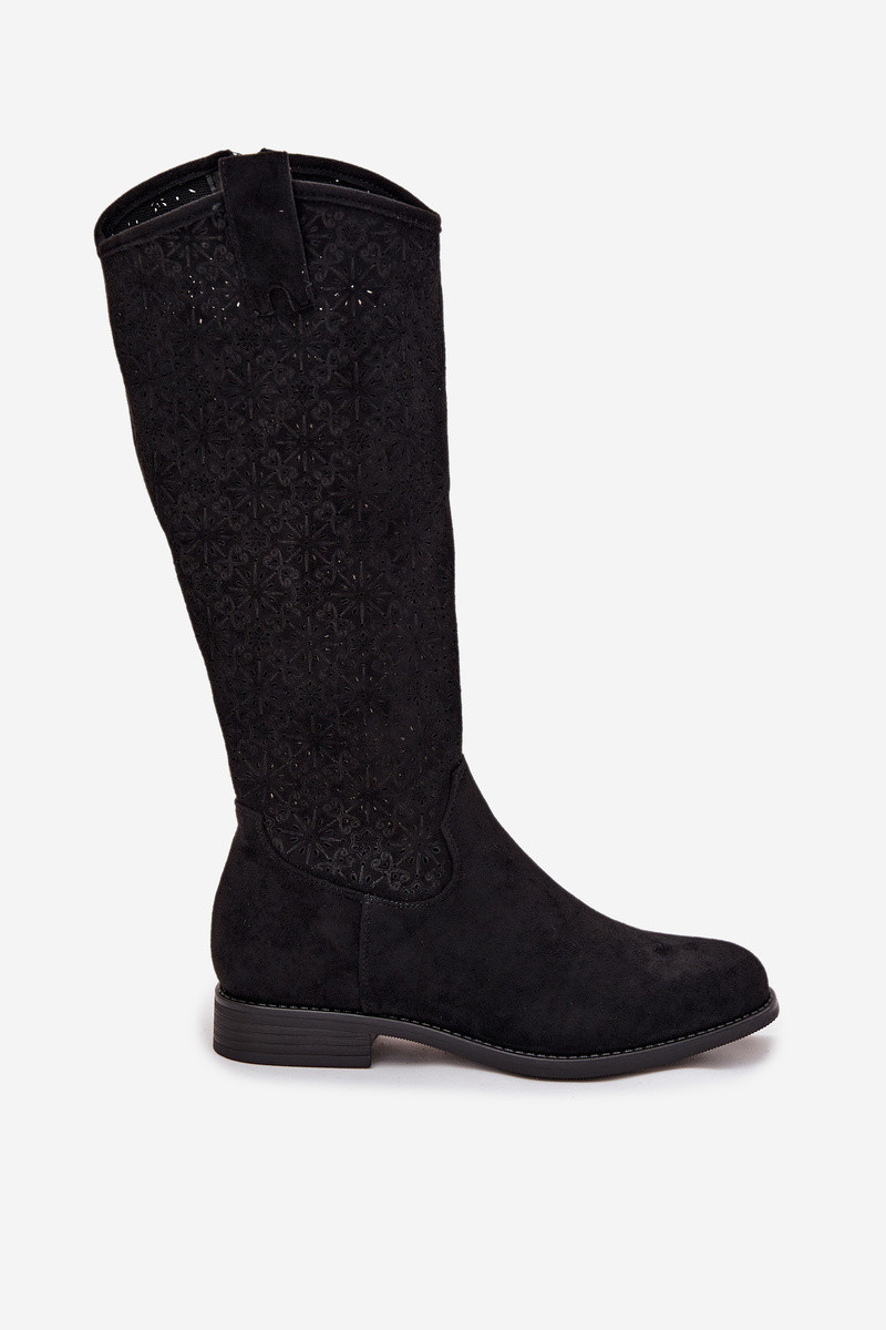Moteriški ilgaauliai batai su ažūro elementais ir plačiais kulniukais S.Barski HY52-534 juodos spalvos