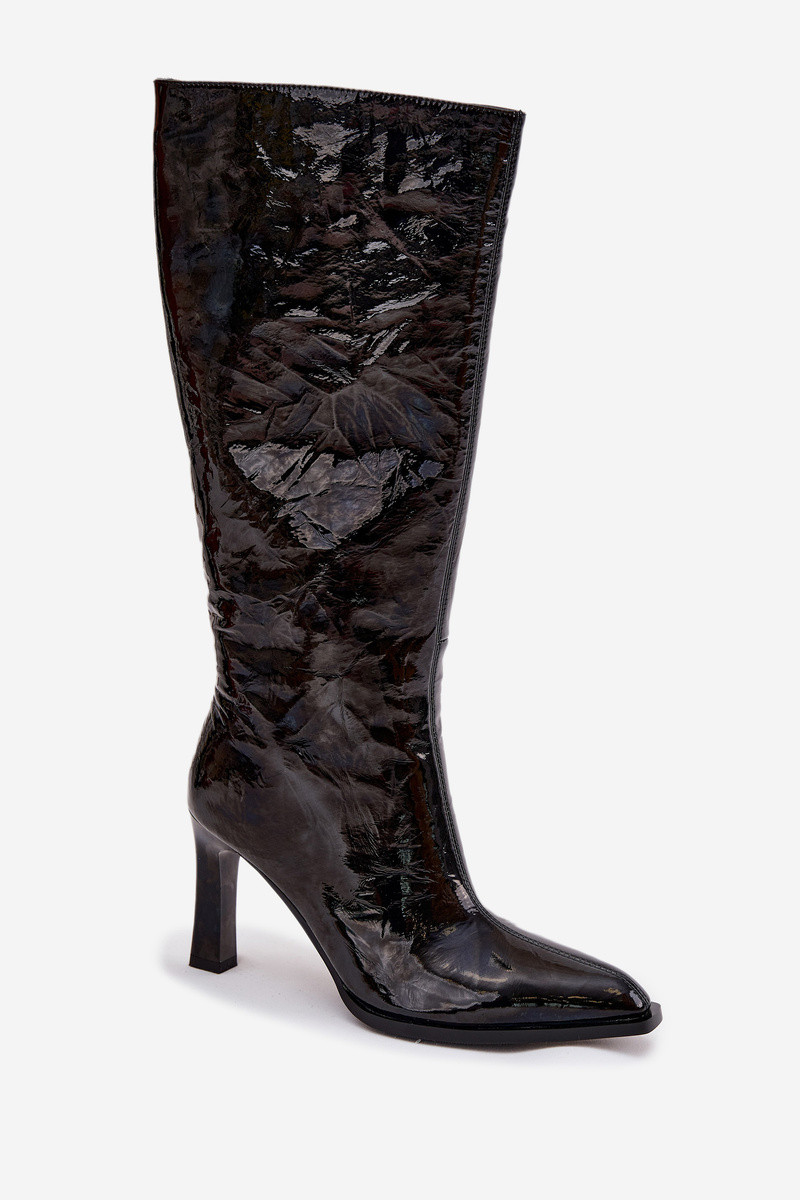 Laku dengtos odos moteriški ilgaauliai batai su kulniukais pašiltinti D&A CR52-716 juodos spalvos