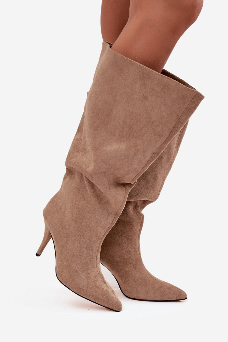 Įsispiriamo modelio moteriški ilgaauliai batai su plonais kulniukais iš dirbtinės zomšos smėlio spalvos Noretta