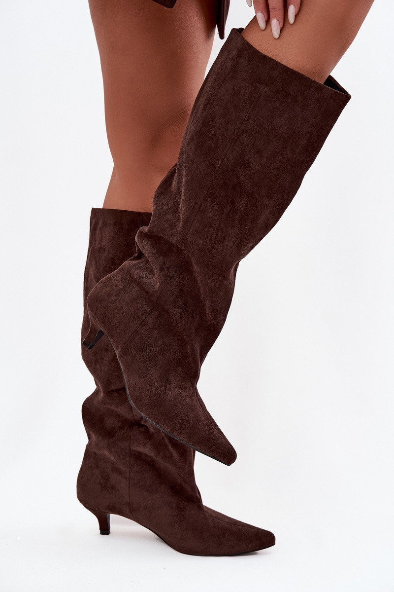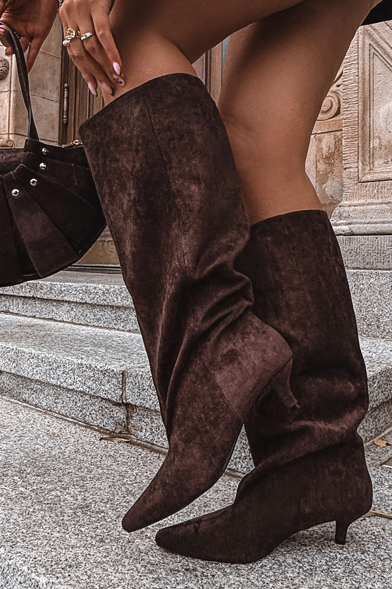 Moteriški ilgaauliai batai su kulniukais iš dirbtinės zomšos šokoladinės spalvos Pheona