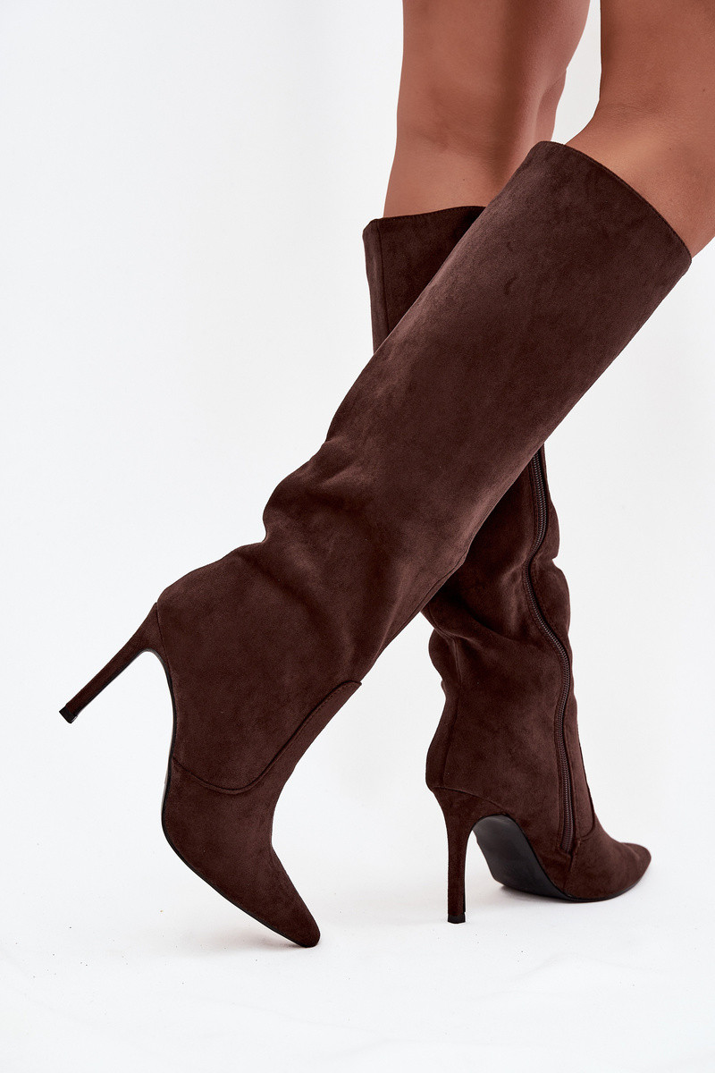 Šokoladiniai pašiltinti moteriški ilgaauliai batai su plonais kulniukais iš dirbtinio zomšo Rosavine