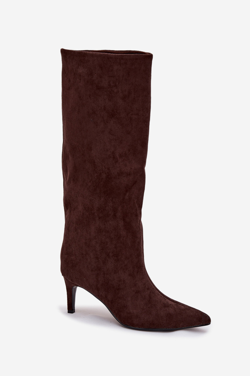 Moteriški ilgaauliai batai įsispiriamo modelio pašiltinti su plonais kulniukais šokoladinės spalvos Olivienne