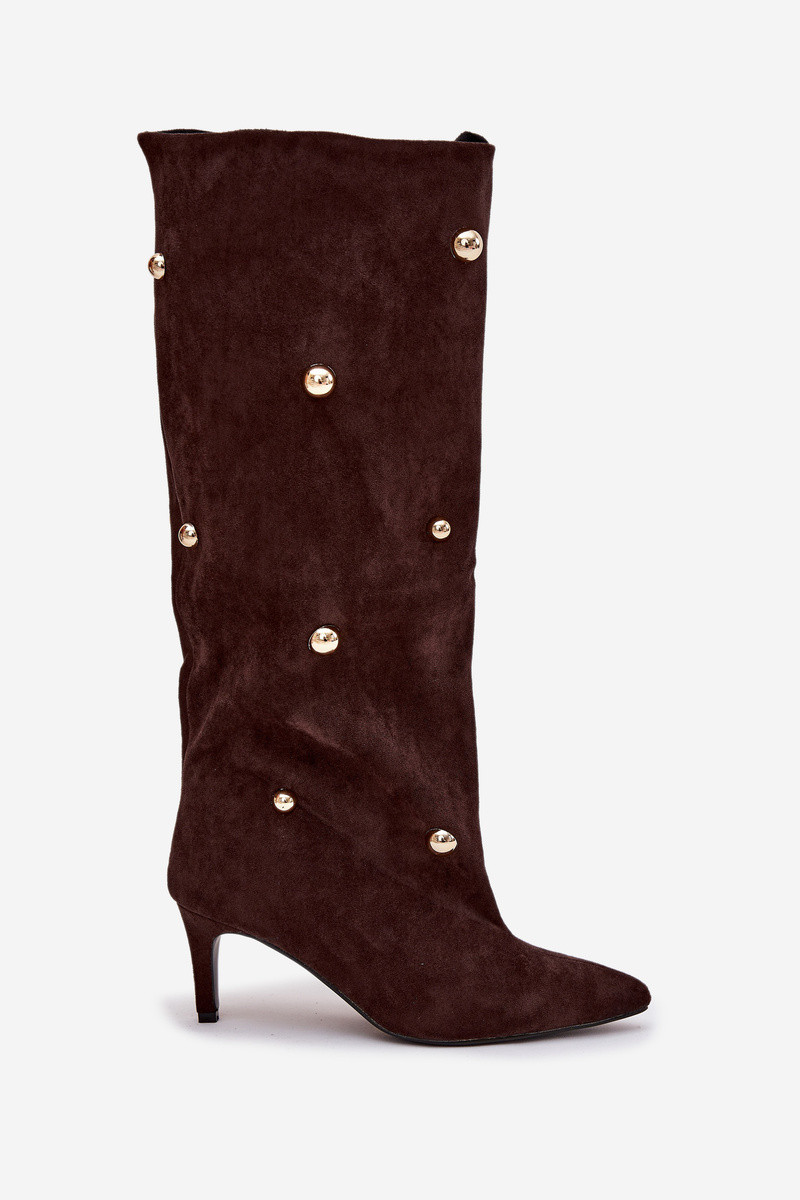 Šokoladinės spalvos įsispiriamo modelio moteriški ilgaauliai batai su plonais kulniukais ir aukso spalvos papuošimais Thaliane