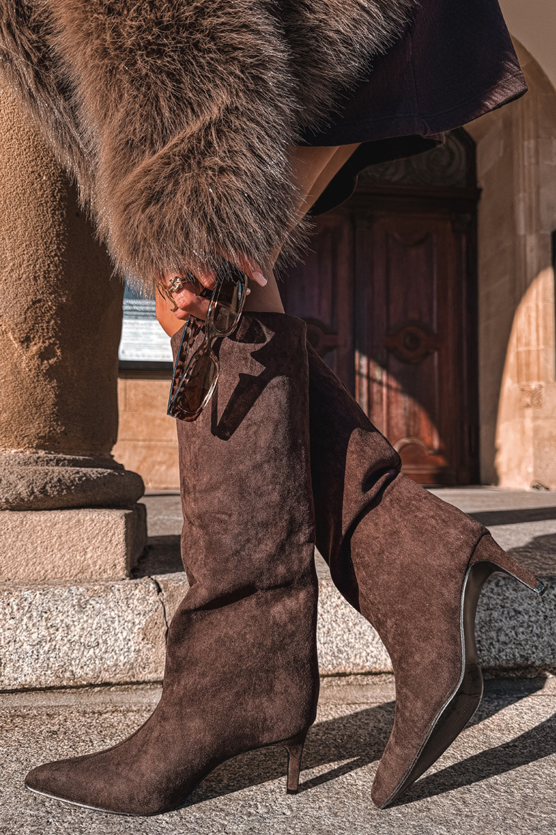 Moteriški ilgaauliai batai iš dirbtinio zomšo, įsispiriamo modelio su plonais kulniukais, šokoladinės spalvos Phelin