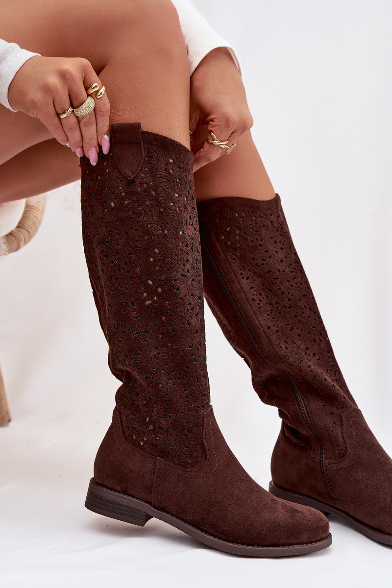 Moteriški ilgaauliai batai su ažūro elementais ir plačiais kulniukais S.Barski HY61-8023, šokoladinės spalvos