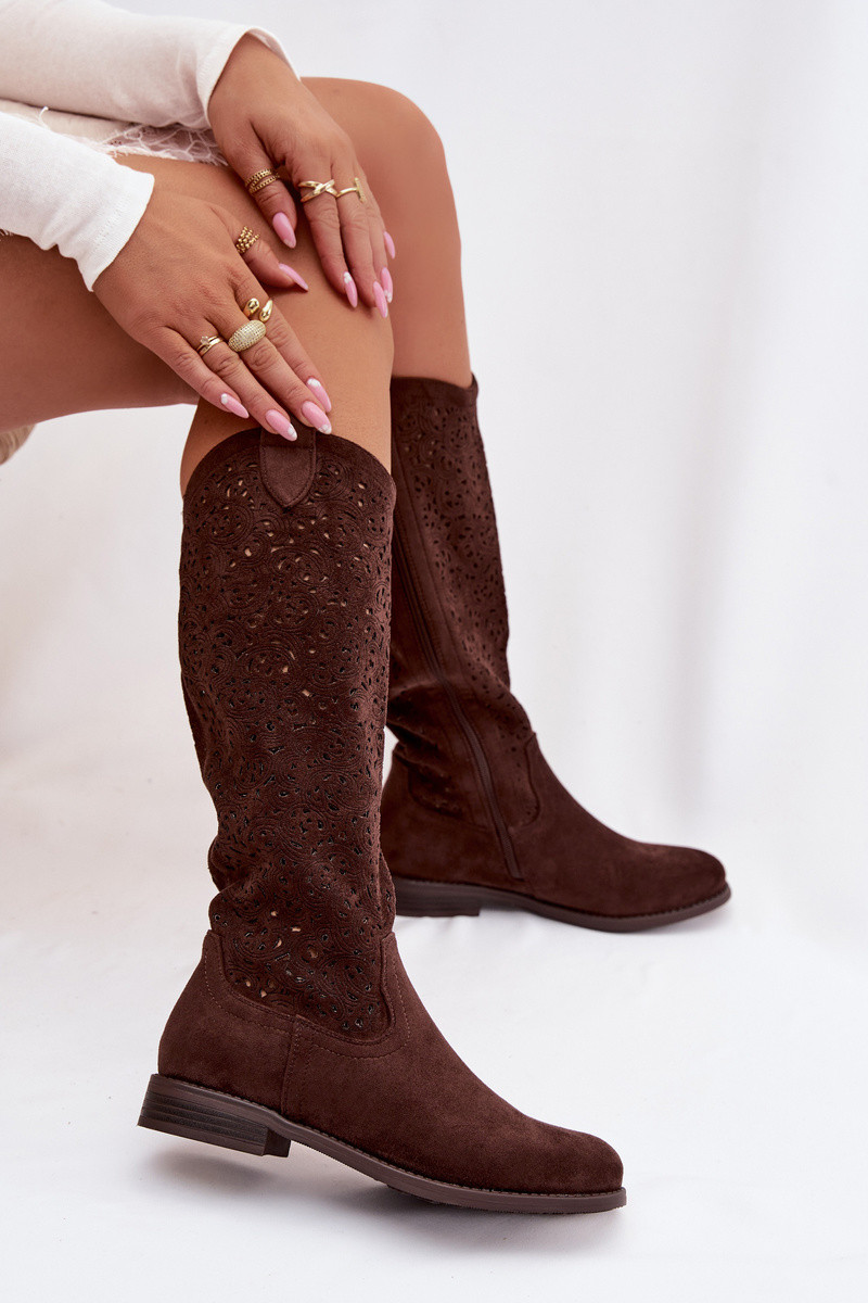 su aužūro elementais moteriški ilgaauliai batai su plačiais kulniukais S.Barski HY61-8023 CzekoladoĮe