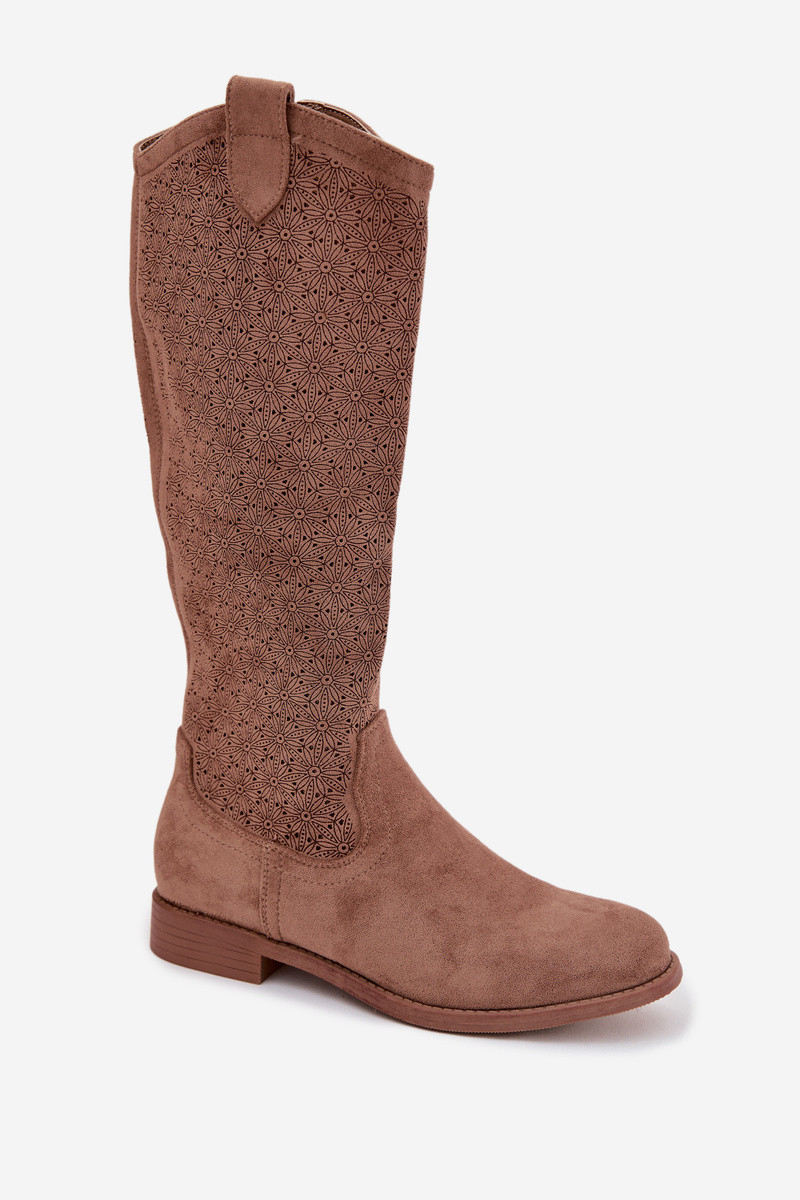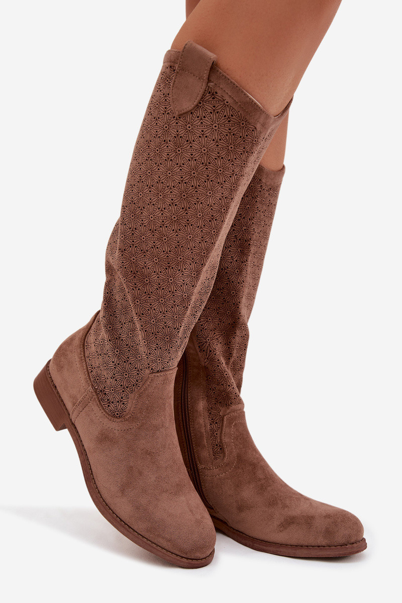 Moteriški ilgaauliai batai su ažūro elementais ir plačiais kulniukais S.Barski HY61-8022 rudos spalvos