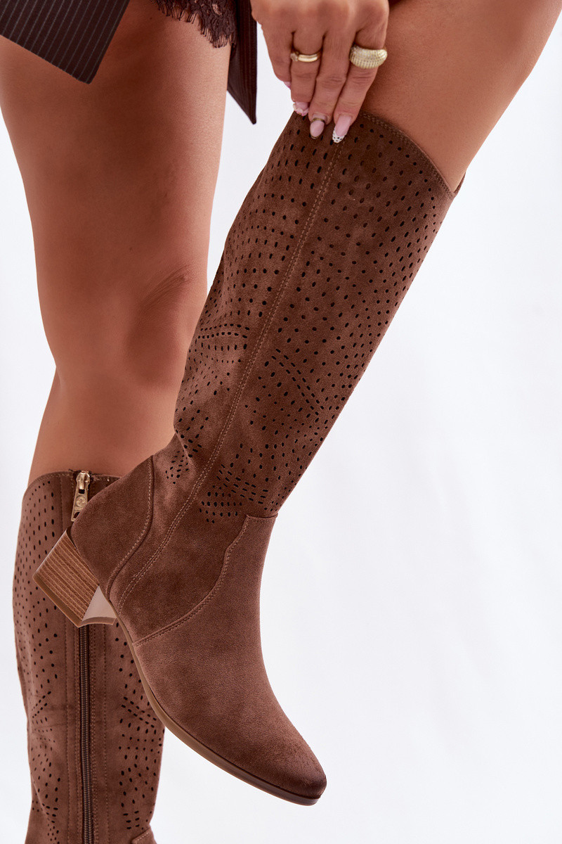 Moteriški ilgaauliai batai su ažūriniais elementais ant žemo kulno Vinceza 58637 rudos spalvos
