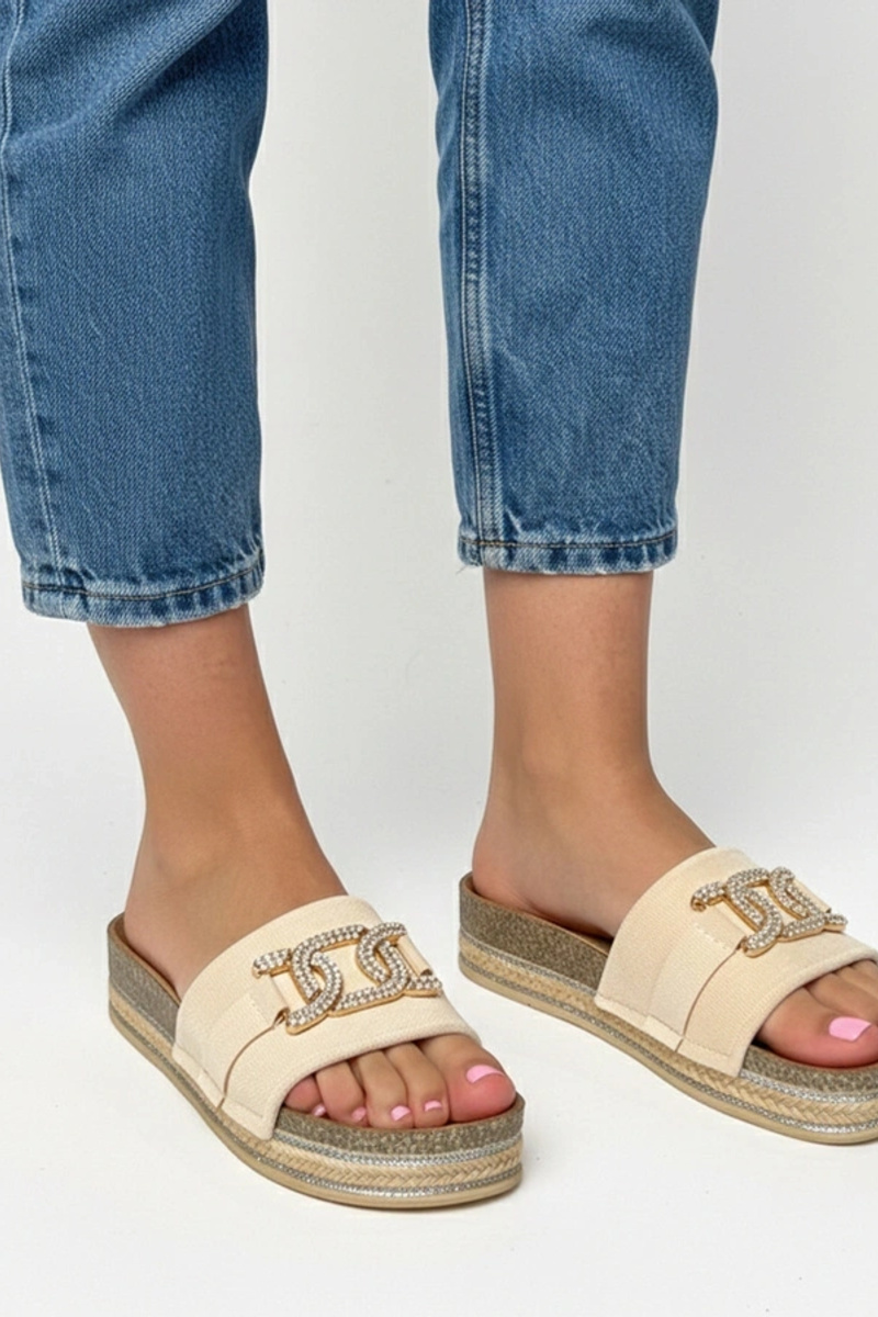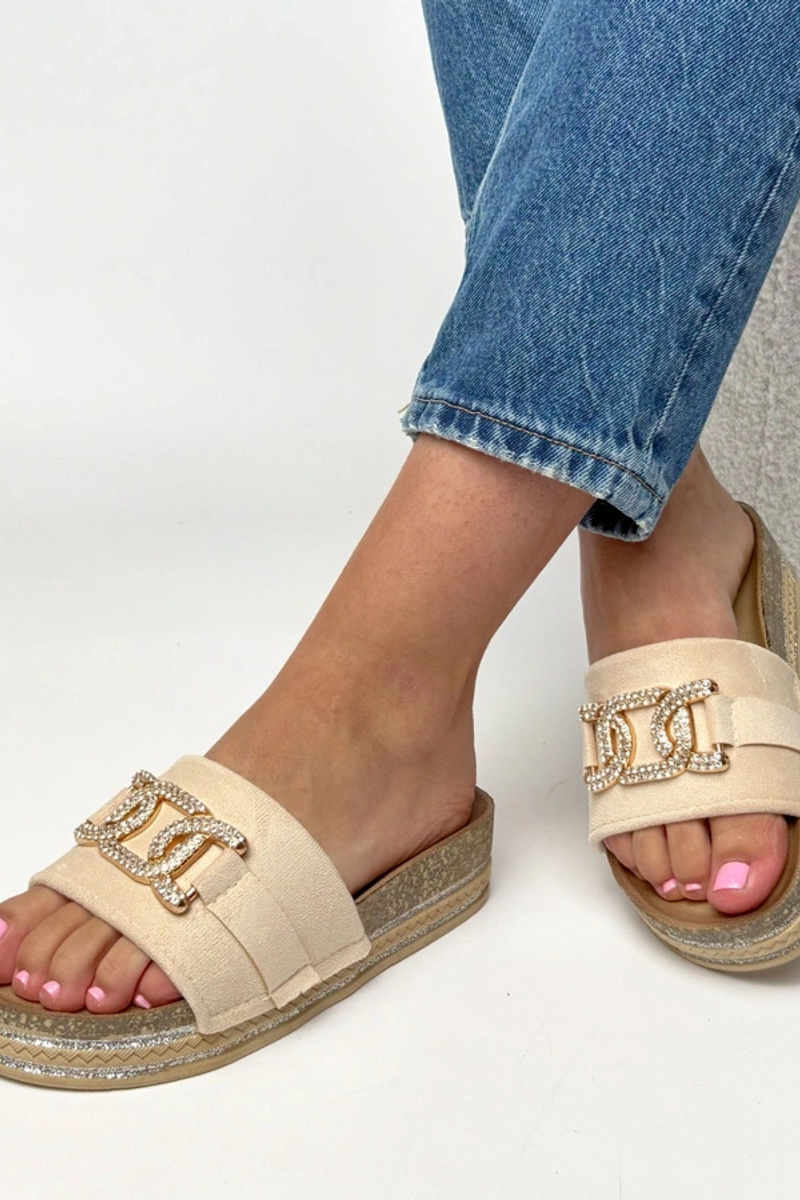 Smėlio spalvos šlepetės platformoje su blizgančiais papuošalais Faustine