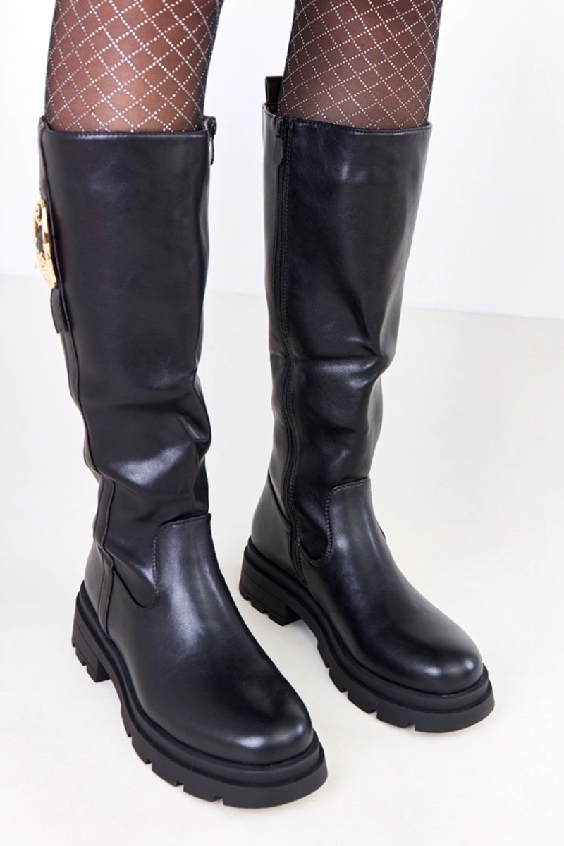 Juodi dirbtinės odos ilgaauliai su aukso papuošimu Meliros
