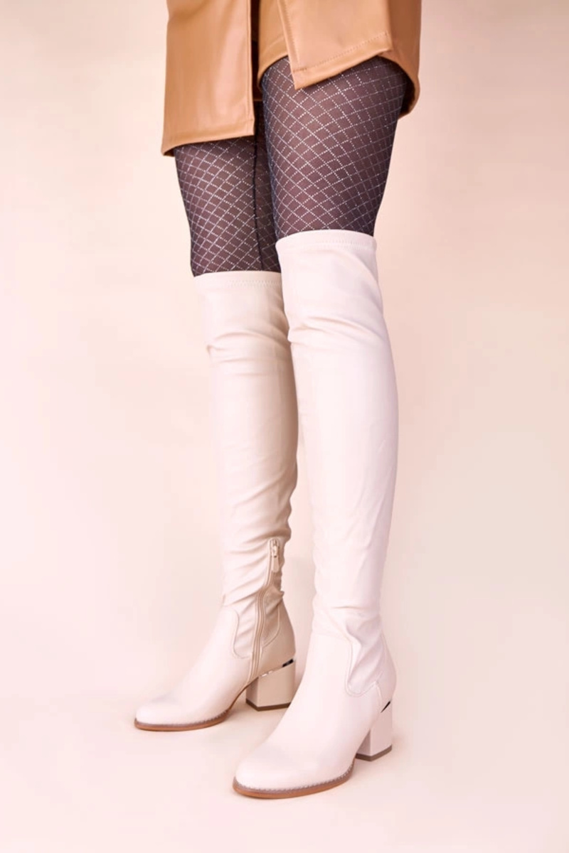 Smėlio spalvos ilgaauliai batai virš kelių ant dekoratyvinio kulno Onka