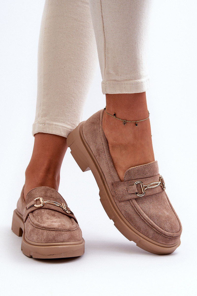 moteriški mokasinai su aukso spalvos detalėmis iš eko zomšosoĮe rudos spalvos Lighas
