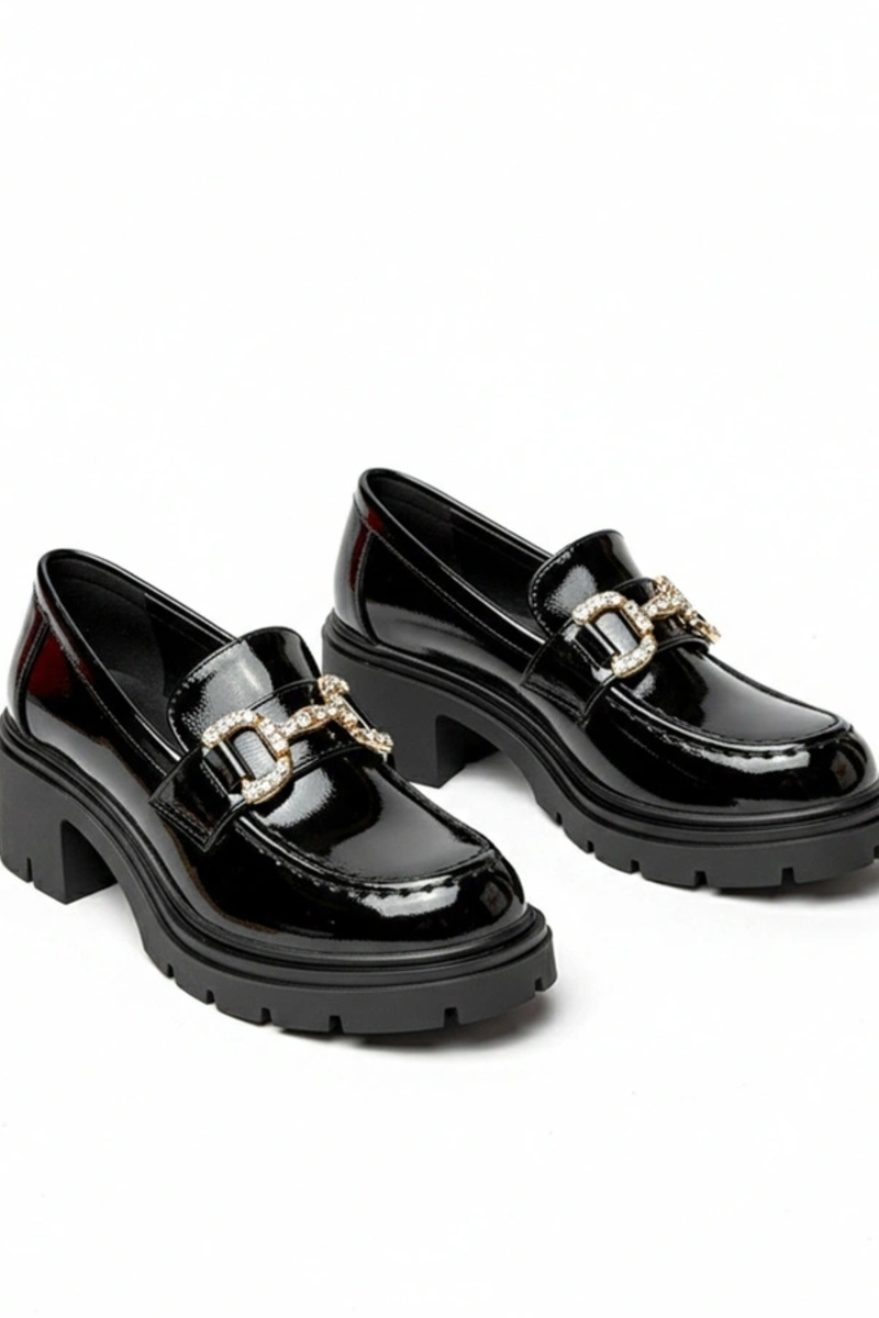 Juodi lakuoti mokasinai su kulnu ir cirkoniais Paola