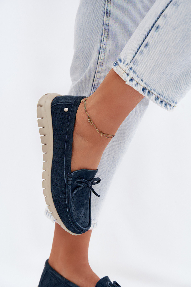 Tamsiai mėlynos spalvos dirbtinės zomšos moteriški mokasinai su kaspinais Vinceza 95401