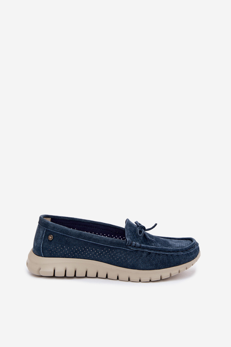 VINCEZATamsiai mėlynos spalvos dirbtinės zomšos moteriški mokasinai su kaspinais Vinceza 95401