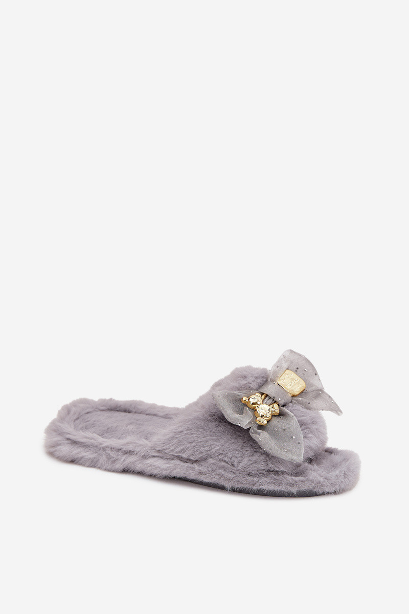 Pilkos spalvos moteriškos šlepetės su kailiuku, kaspinais ir aukso puošyba „Nolara"