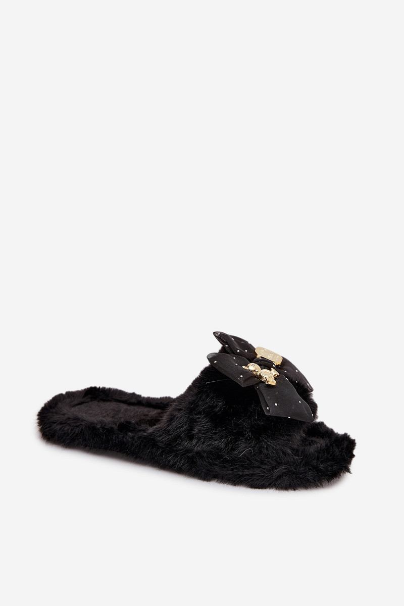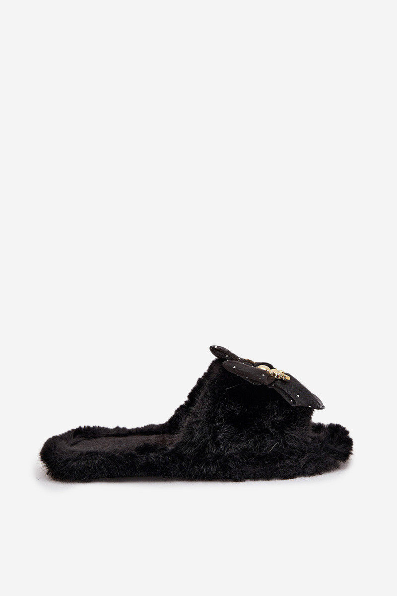Juodos spalvos moteriškos šlepetės su kailiuku, kaspinais ir aukso puošyba „Nolara"