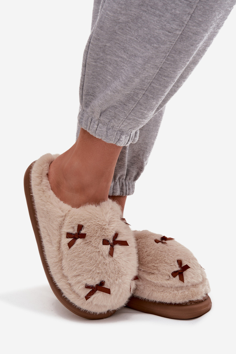 Moteriškos šlepetės su kailiu ir kaspinėliais smėlio spalvos Saviera