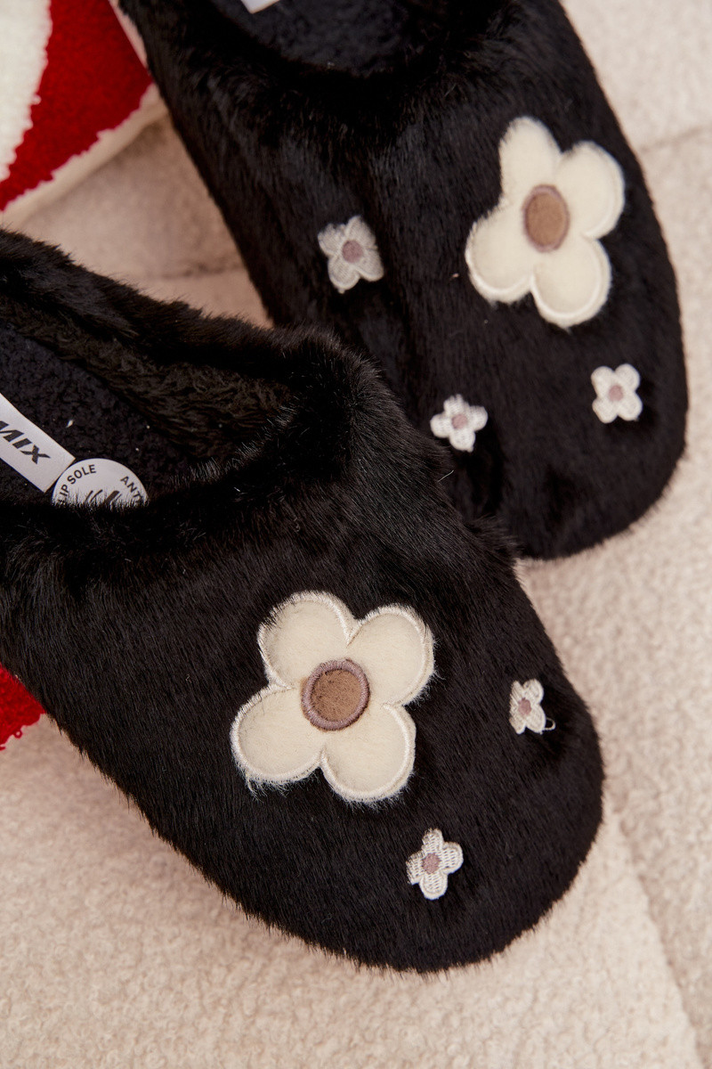 Juodos Selinne šlepetės su kailiuku ir gėlių motyvais