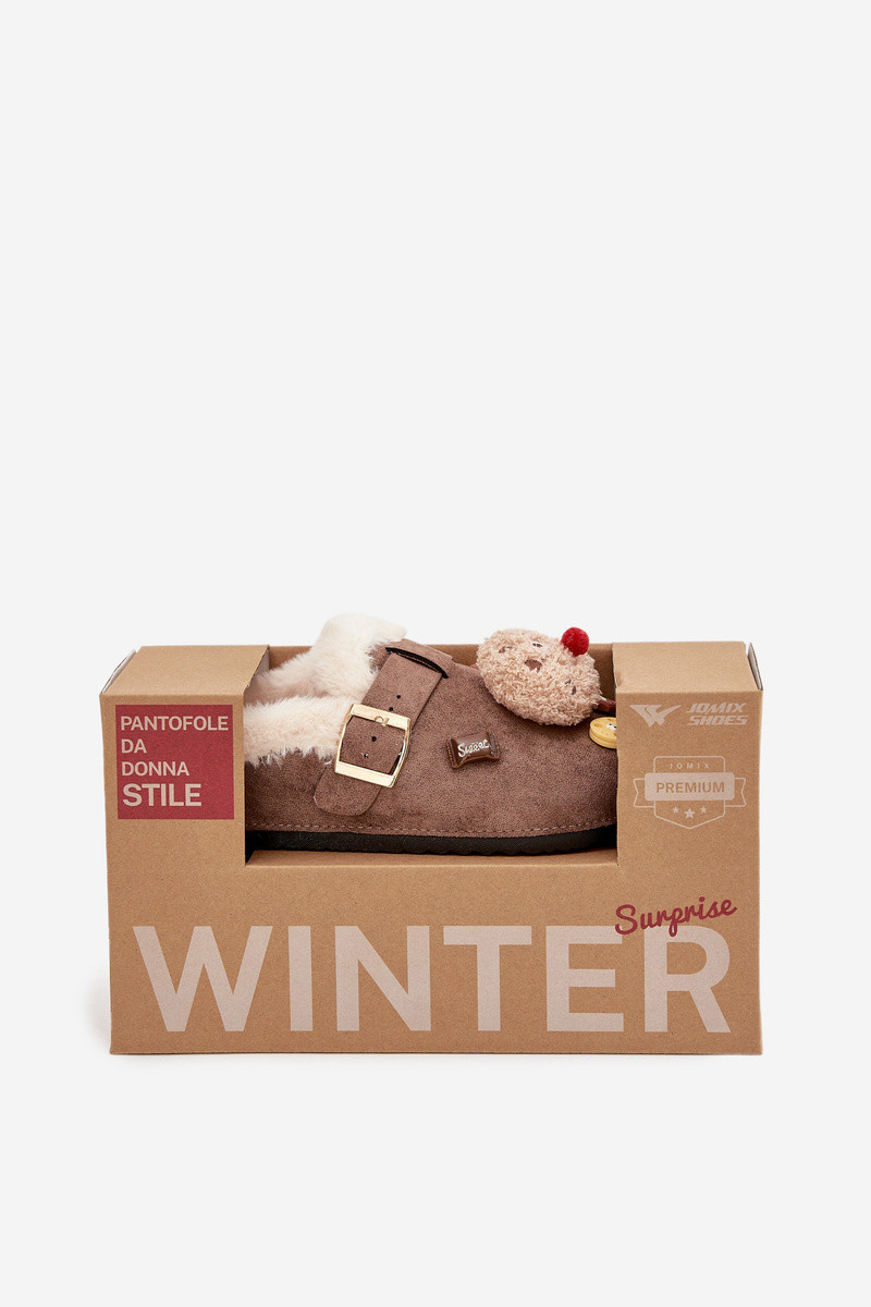 Moteriškos šlepetės su gražiomis detalėmis ir sagtimis, pašiltintos kailiuku viduje, rudos spalvos „Thalora"