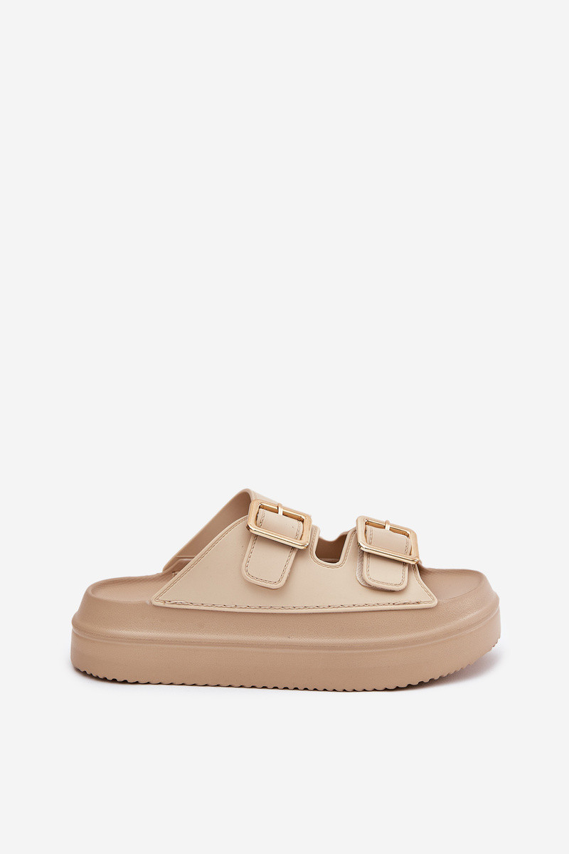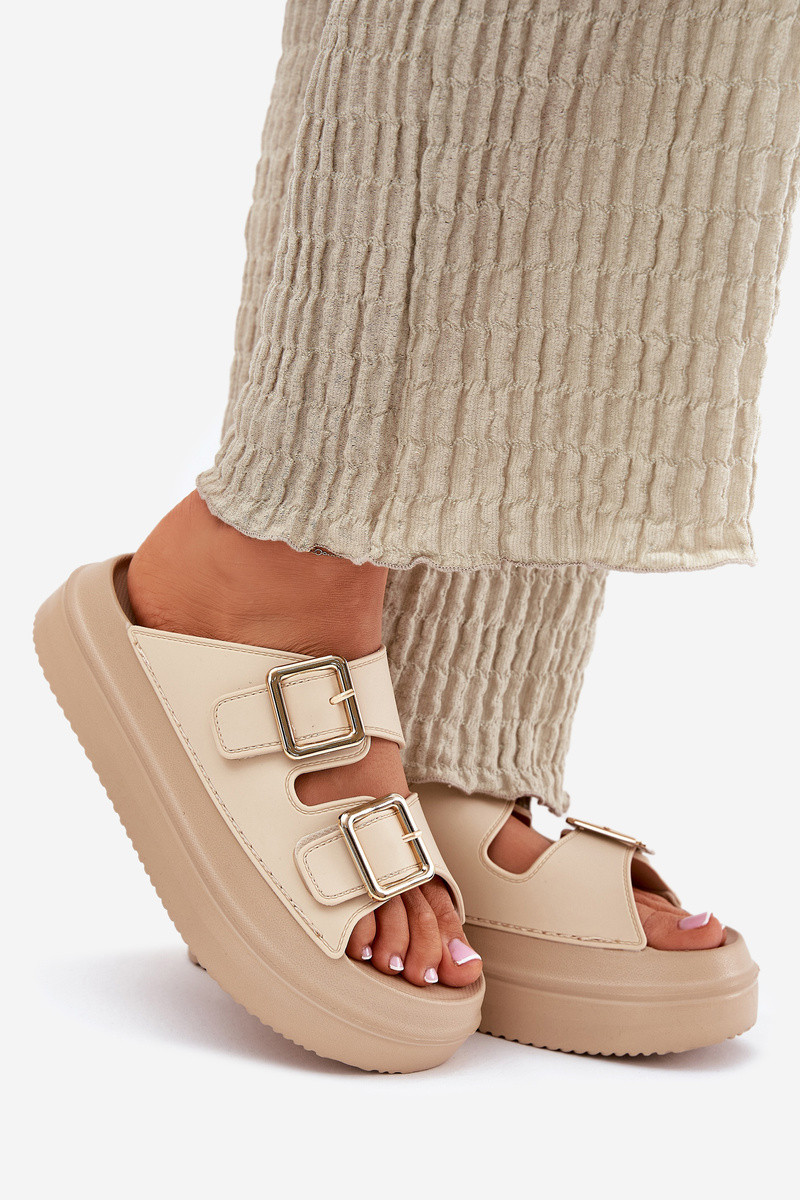 Moteriškos šlepetės su platforma Ze aukso spalvosmi su sagtimismi smėlio spalvos Zorila
