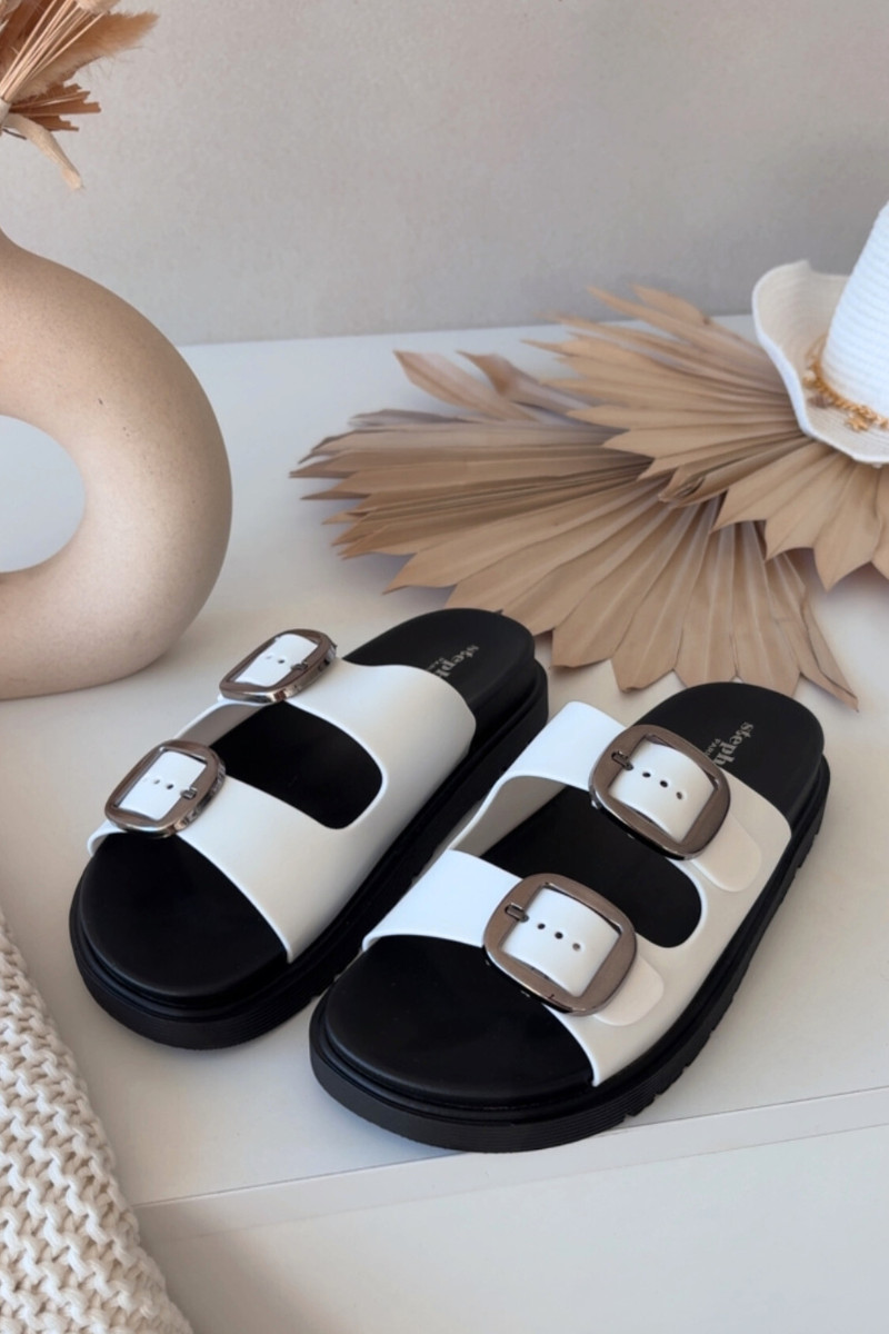 Baltos spalvos moteriškos šlepetės Elamas su sagtimis ir platforma