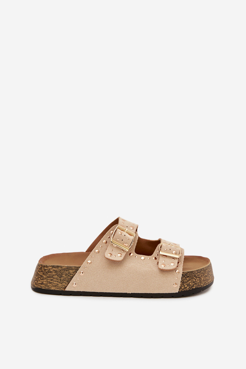Moteriškos dramblio kaulo spalvos šlepetės su aukso spalvos sagtimis ir smeigėmis Tervina