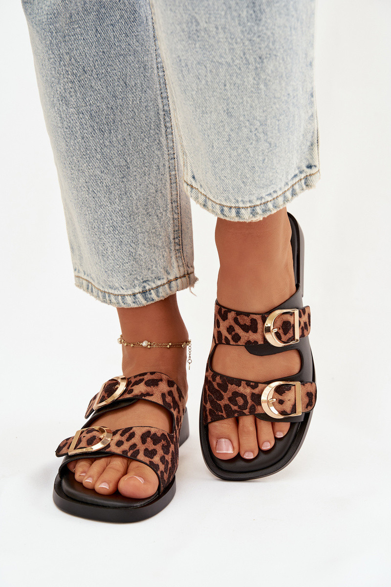 Moteriškos šlepetės aukso spalvos su sagtimis su leopardo kailio raštais juodos ir rudos spalvos Danelle