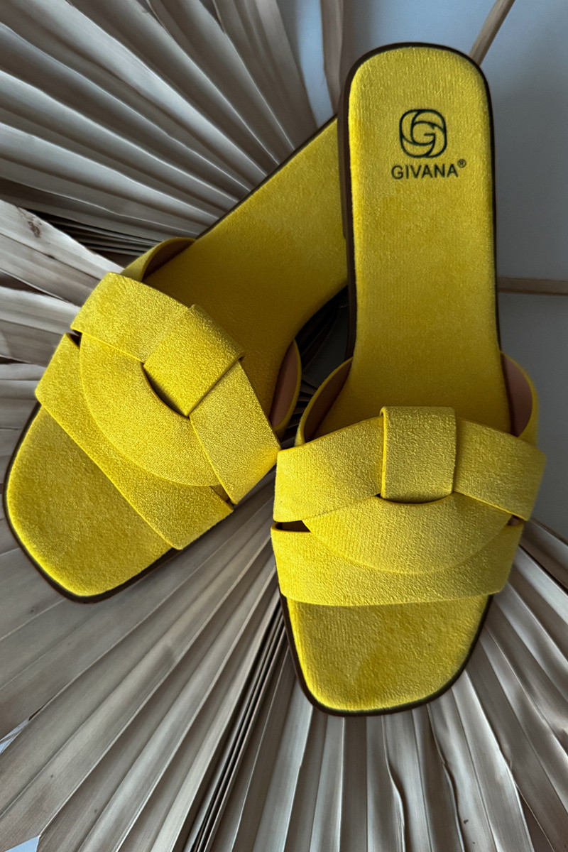 Šlepetės Moteriškas butas su juostelėmis iš eko zomšosoĮe geltonos spalvos Florane