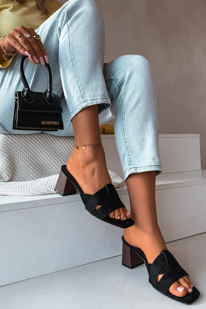 Moteriškos šlepetės su kulniukais ir juostelėmis iš dirbtinio zomšo, juodos spalvos, Corivelle