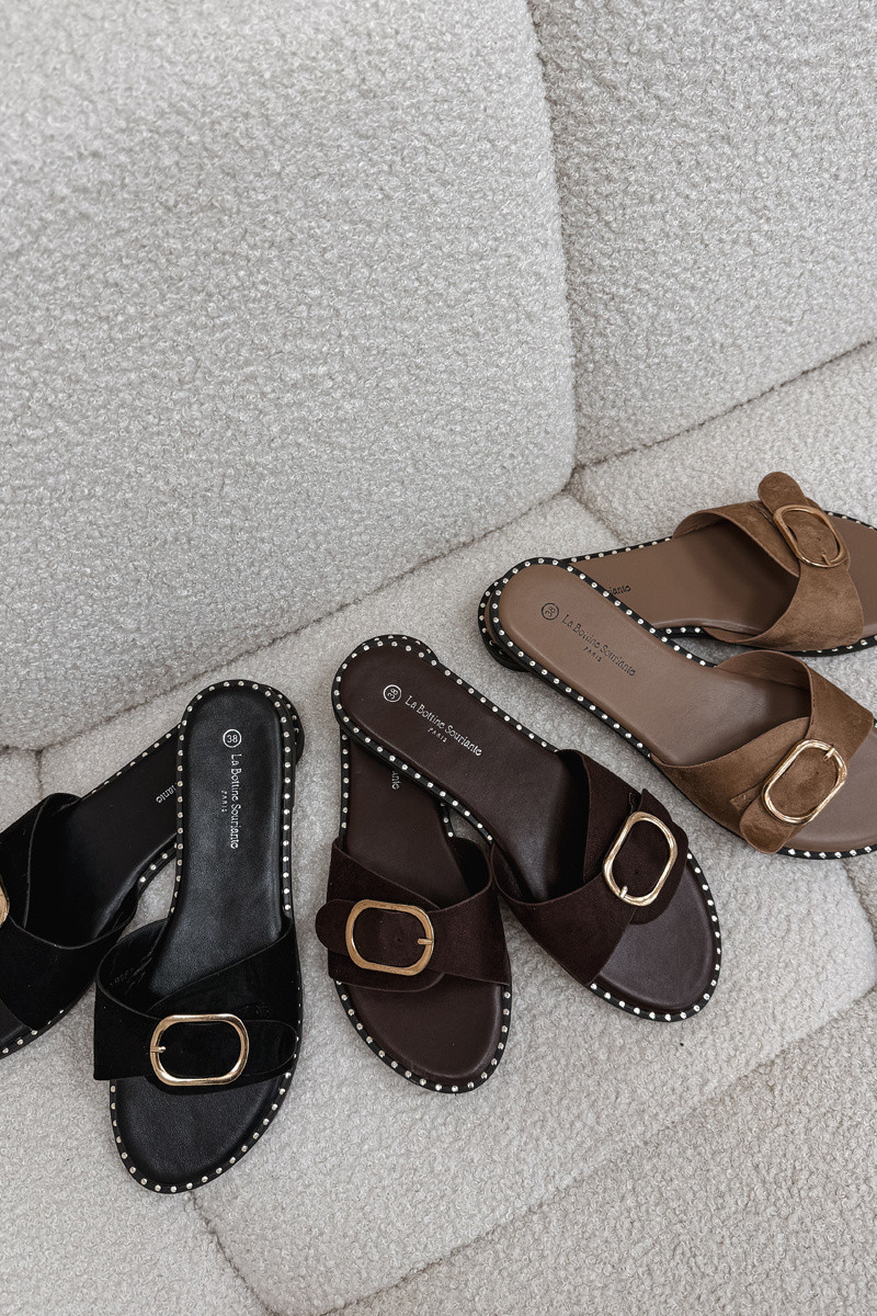 Moteriškos šlepetės su plačiais kulniukais su aukso spalvos sagtimis juodos spalvos Selivelle
