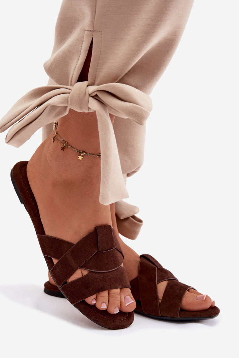 Lygiapadės moteriškos šlepetės su juostelėmis šokoladinės spalvos Pavelle
