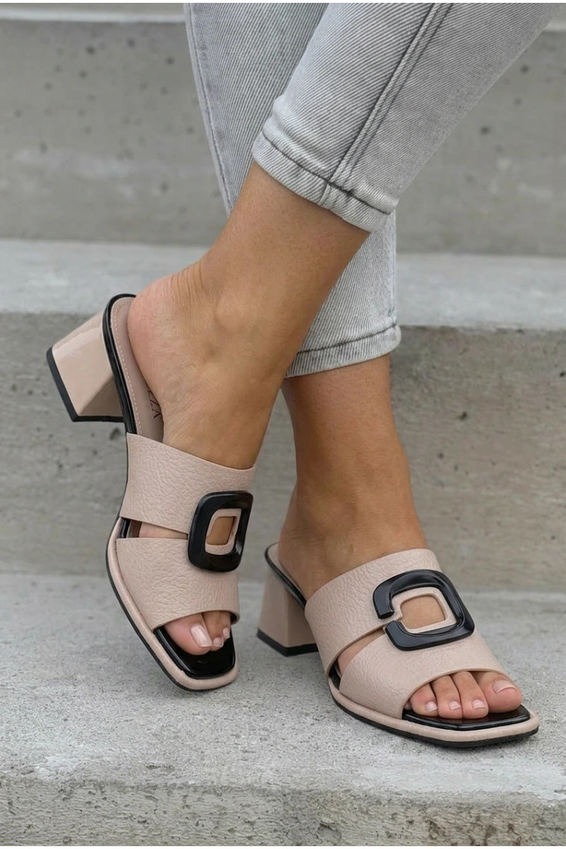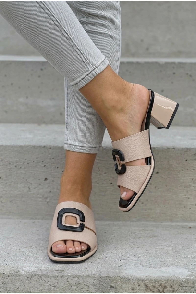 Moterų šlepetės su išpjovomis ir sagtimis ant kulniukų Vinceza 62284 smėlio spalvos