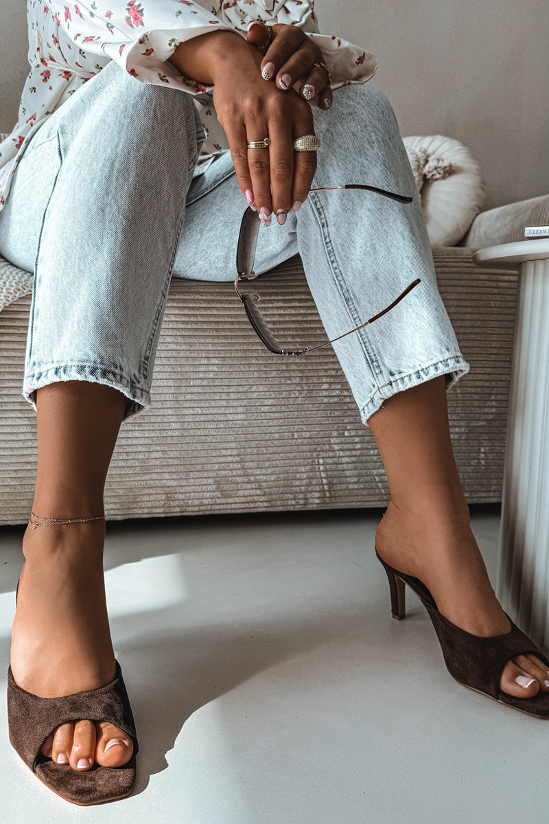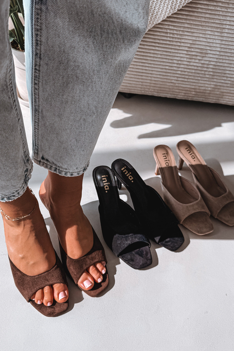 Moteriškos šlepetės su plonu kulniuku šokolado spalvos Revina