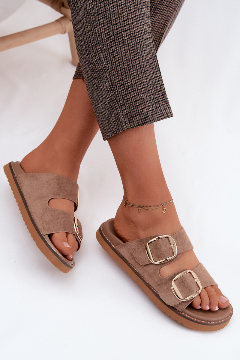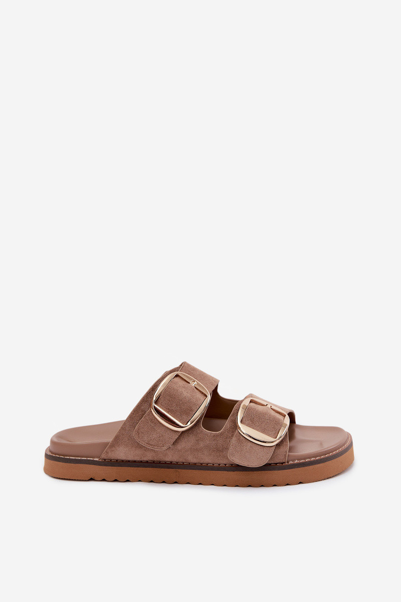 Moteriškos šlepetėssuImitacji iš zomšosu aukso spalvos su sagtelėmis rudos spalvos Averia