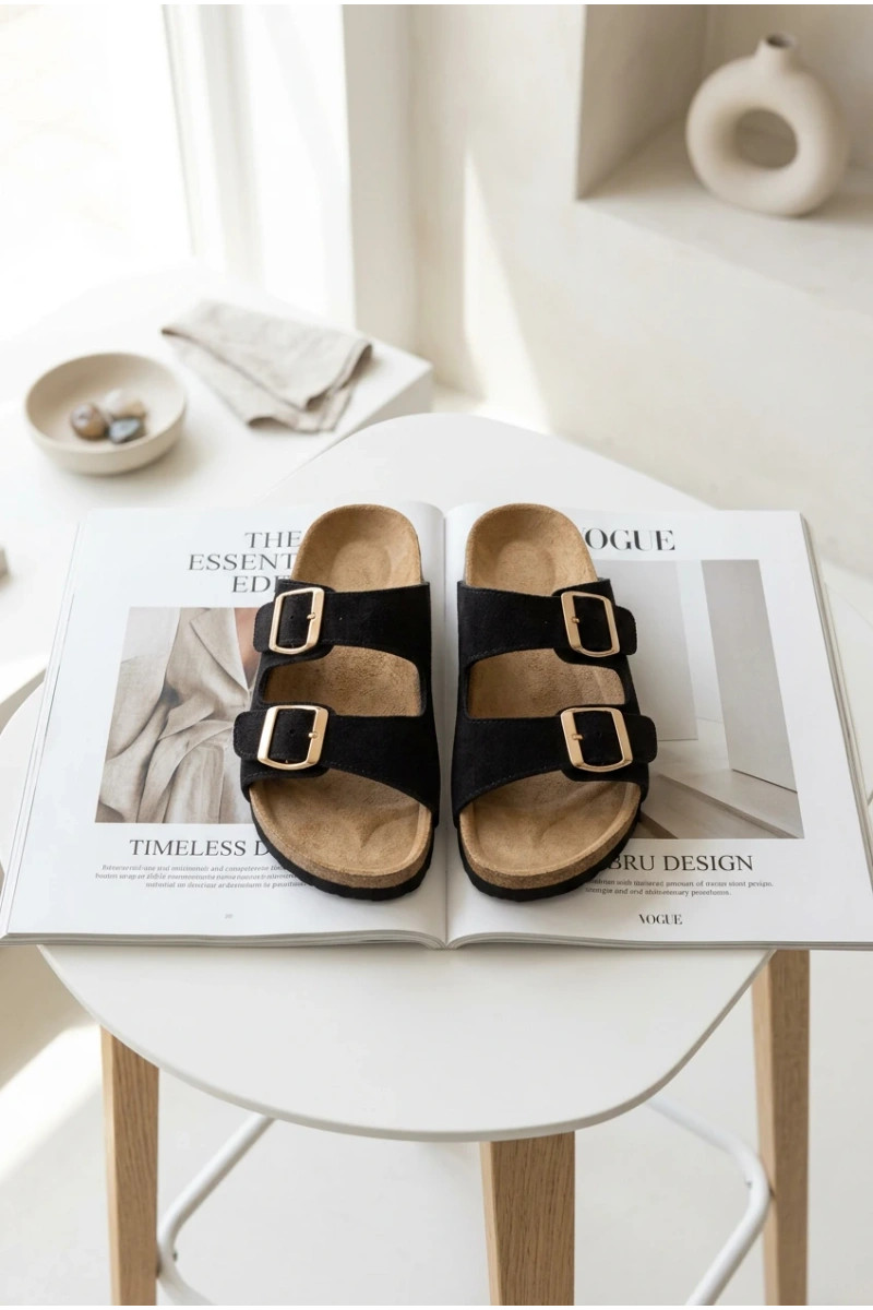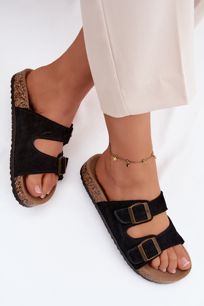 zomšinės šlepetės Ant kamštinio pado su sagtimis juodos spalvos Tavira