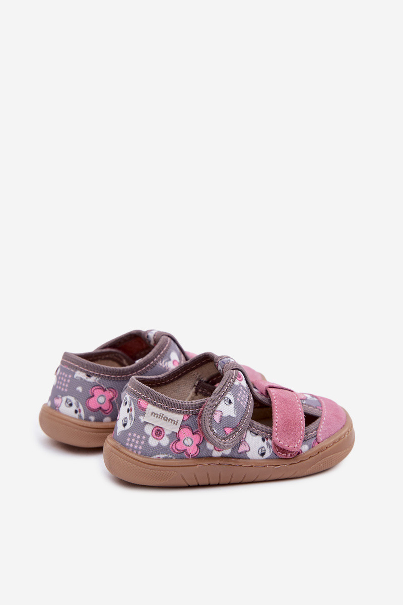 Vaikiškos basomėjimo šlepetės Milami su katytėmis ir gėlytėmis pilkos-rožinės spalvos Lumi